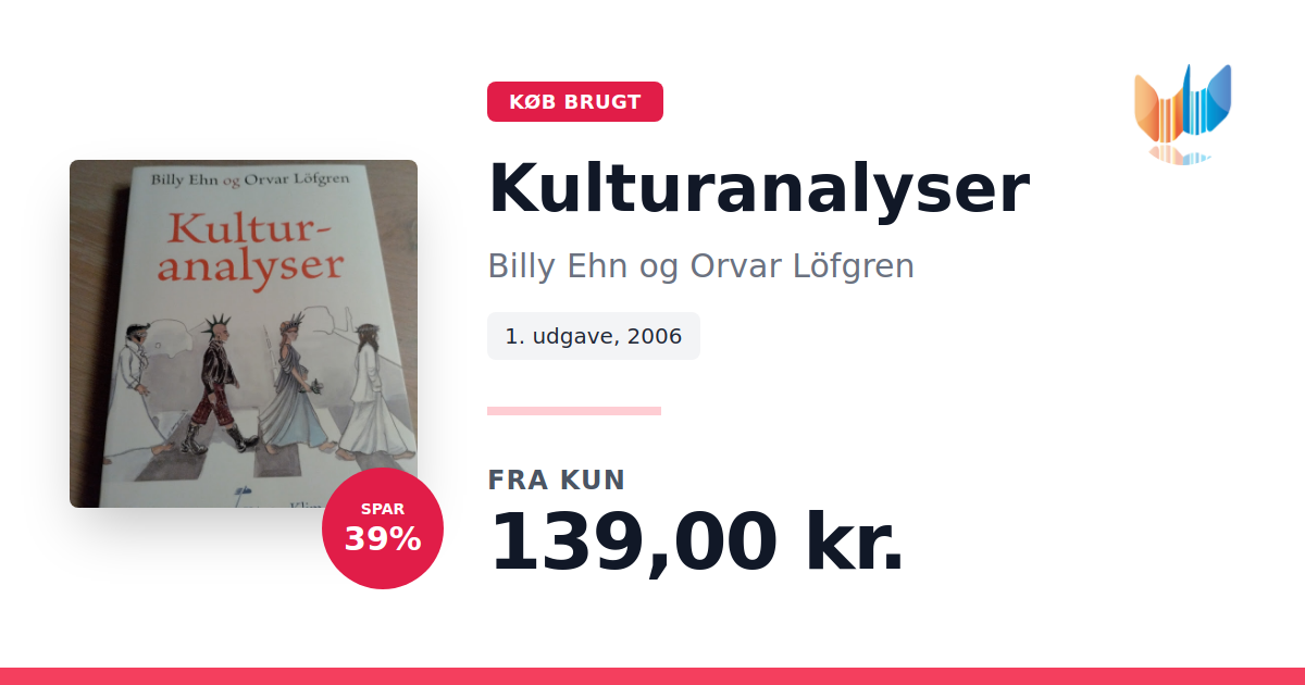 Kulturanalyser, skrevet af Billy Ehn og Orvar Löfgren, præsenterer en innovativ tilgang til at udforske kulturens nuancer i hverdagen og i institutionerne. Med udgangspunkt i Cultural Studies tilbyder bogen et redskab til at afdække skjulte magtstrukturer, kommunikationsmønstre og de uventede kulturelle dimensioner, som ofte overses i den daglige praksis. Gennem en inspirerende metode opfordrer forfatterne pædagogiske undersøgere og praktikere til at se ud over det åbenlyse og opdage kulturens tilstedeværelse, hvor man mindst venter det. Kulturanalyser fremstår således som en værdifuld hjælp til at forny tilgangen i både feltarbejde og pædagogiske studier.