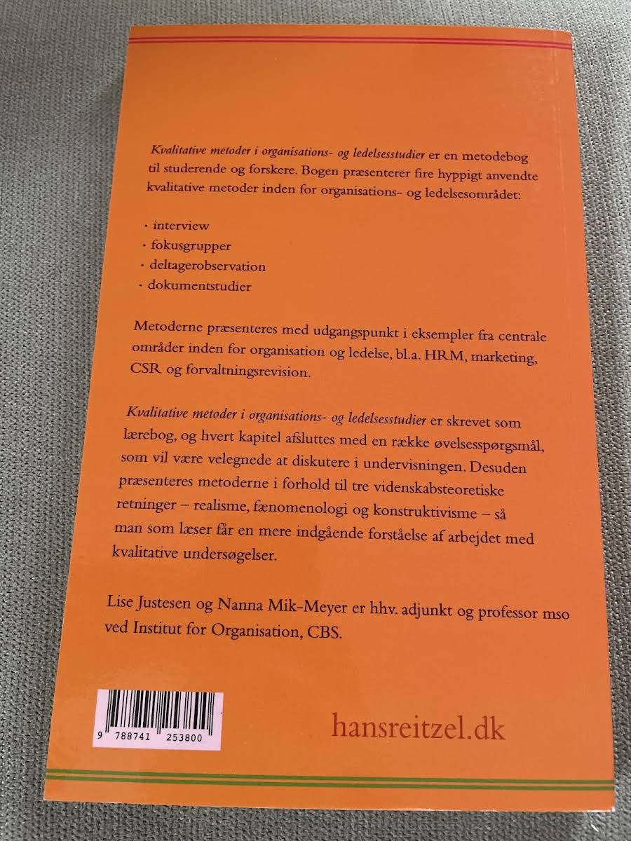 Kvalitative metoder i organisations- og ledelsesstudier er en metodebog for både studerende og forskere, som præsenterer de fire mest anvendte kvalitative metoder inden for organisation og ledelse: interview, fokusgrupper, deltagerobservation og dokumentstudier. Bogen illustrerer metoderne med praktiske eksempler fra centrale områder såsom HRM, marketing, CSR og forvaltningsrevision – og giver dermed et godt udgangspunkt for at forstå, hvordan kvalitative metoder kan anvendes i praksis. Bogen er opbygget som en lærebog, hvor hvert kapitel afsluttes med øvelsesspørgsmål, der inspirerer til refleksion og diskussion. Desuden belyses metoderne ud fra tre videnskabsteoretiske retninger – realisme, fænomenologi og konstruktivisme – hvilket bidrager til en nuanceret tilgang til kvalitative undersøgelser. Lise Justesen og Nanna Mik-Meyer giver med denne udgivelse et værdifuldt redskab til at navigere i organisations- og ledelsesforskningens verden.