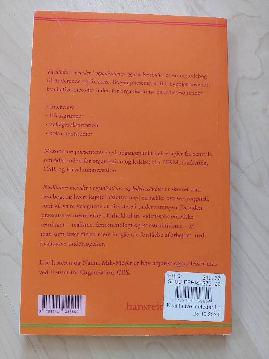 Kvalitative metoder i organisations- og ledelsesstudier er en metodebog for både studerende og forskere, som præsenterer de fire mest anvendte kvalitative metoder inden for organisation og ledelse: interview, fokusgrupper, deltagerobservation og dokumentstudier. Bogen illustrerer metoderne med praktiske eksempler fra centrale områder såsom HRM, marketing, CSR og forvaltningsrevision – og giver dermed et godt udgangspunkt for at forstå, hvordan kvalitative metoder kan anvendes i praksis. Bogen er opbygget som en lærebog, hvor hvert kapitel afsluttes med øvelsesspørgsmål, der inspirerer til refleksion og diskussion. Desuden belyses metoderne ud fra tre videnskabsteoretiske retninger – realisme, fænomenologi og konstruktivisme – hvilket bidrager til en nuanceret tilgang til kvalitative undersøgelser. Lise Justesen og Nanna Mik-Meyer giver med denne udgivelse et værdifuldt redskab til at navigere i organisations- og ledelsesforskningens verden.