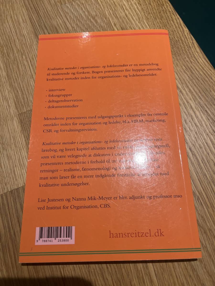 Kvalitative metoder i organisations- og ledelsesstudier er en metodebog for både studerende og forskere, som præsenterer de fire mest anvendte kvalitative metoder inden for organisation og ledelse: interview, fokusgrupper, deltagerobservation og dokumentstudier. Bogen illustrerer metoderne med praktiske eksempler fra centrale områder såsom HRM, marketing, CSR og forvaltningsrevision – og giver dermed et godt udgangspunkt for at forstå, hvordan kvalitative metoder kan anvendes i praksis. Bogen er opbygget som en lærebog, hvor hvert kapitel afsluttes med øvelsesspørgsmål, der inspirerer til refleksion og diskussion. Desuden belyses metoderne ud fra tre videnskabsteoretiske retninger – realisme, fænomenologi og konstruktivisme – hvilket bidrager til en nuanceret tilgang til kvalitative undersøgelser. Lise Justesen og Nanna Mik-Meyer giver med denne udgivelse et værdifuldt redskab til at navigere i organisations- og ledelsesforskningens verden.