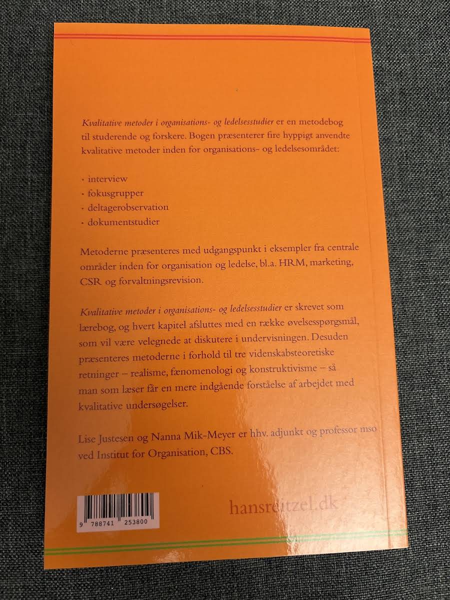 Kvalitative metoder i organisations- og ledelsesstudier er en metodebog for både studerende og forskere, som præsenterer de fire mest anvendte kvalitative metoder inden for organisation og ledelse: interview, fokusgrupper, deltagerobservation og dokumentstudier. Bogen illustrerer metoderne med praktiske eksempler fra centrale områder såsom HRM, marketing, CSR og forvaltningsrevision – og giver dermed et godt udgangspunkt for at forstå, hvordan kvalitative metoder kan anvendes i praksis. Bogen er opbygget som en lærebog, hvor hvert kapitel afsluttes med øvelsesspørgsmål, der inspirerer til refleksion og diskussion. Desuden belyses metoderne ud fra tre videnskabsteoretiske retninger – realisme, fænomenologi og konstruktivisme – hvilket bidrager til en nuanceret tilgang til kvalitative undersøgelser. Lise Justesen og Nanna Mik-Meyer giver med denne udgivelse et værdifuldt redskab til at navigere i organisations- og ledelsesforskningens verden.