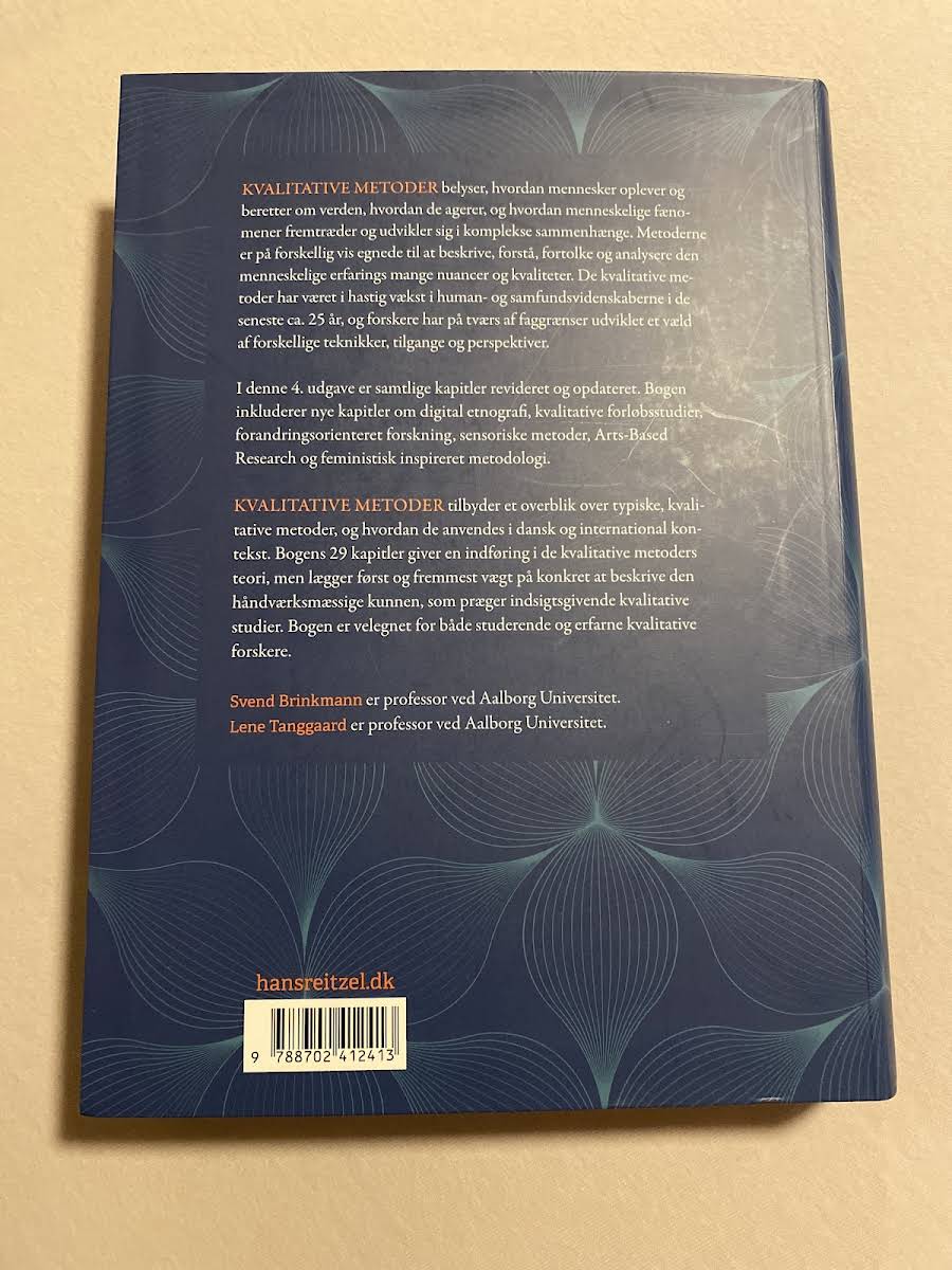 KVALITATIVE METODER – En grundbog giver en omfattende introduktion til, hvordan menneskelige erfaringer og fortællinger om verden fremstilles og udvikles i komplekse sammenhænge. I denne 4. udgave er alle kapitler omhyggeligt reviderede og opdaterede – med nye bidrag om digital etnografi, kvalitative forløbsstudier, forandringsorienteret forskning, sensoriske metoder, Arts-Based Research og feministisk inspireret metodologi. Bogen rummer 29 kapitler, der både præsenterer de teoretiske rammer bag kvalitative metoder og understreger de praktiske færdigheder, der er essentielle for at udføre indsigtsgivende studier. Med fokus på både danske og internationale perspektiver afspejler udgaven den hastige vækst inden for human- og samfundsvidenskaberne over de seneste 25 år, og den er derfor et centralt redskab for både studerende og erfarne forskere.