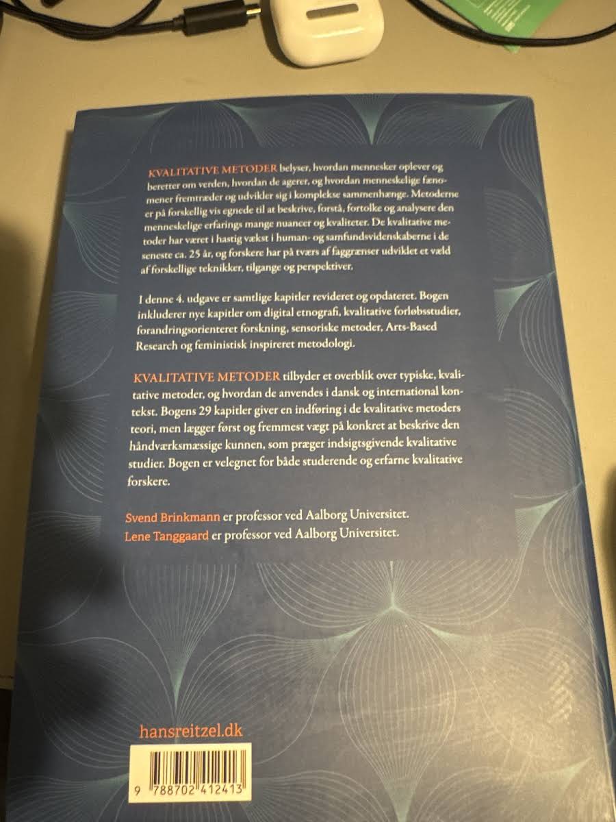 KVALITATIVE METODER – En grundbog giver en omfattende introduktion til, hvordan menneskelige erfaringer og fortællinger om verden fremstilles og udvikles i komplekse sammenhænge. I denne 4. udgave er alle kapitler omhyggeligt reviderede og opdaterede – med nye bidrag om digital etnografi, kvalitative forløbsstudier, forandringsorienteret forskning, sensoriske metoder, Arts-Based Research og feministisk inspireret metodologi. Bogen rummer 29 kapitler, der både præsenterer de teoretiske rammer bag kvalitative metoder og understreger de praktiske færdigheder, der er essentielle for at udføre indsigtsgivende studier. Med fokus på både danske og internationale perspektiver afspejler udgaven den hastige vækst inden for human- og samfundsvidenskaberne over de seneste 25 år, og den er derfor et centralt redskab for både studerende og erfarne forskere.