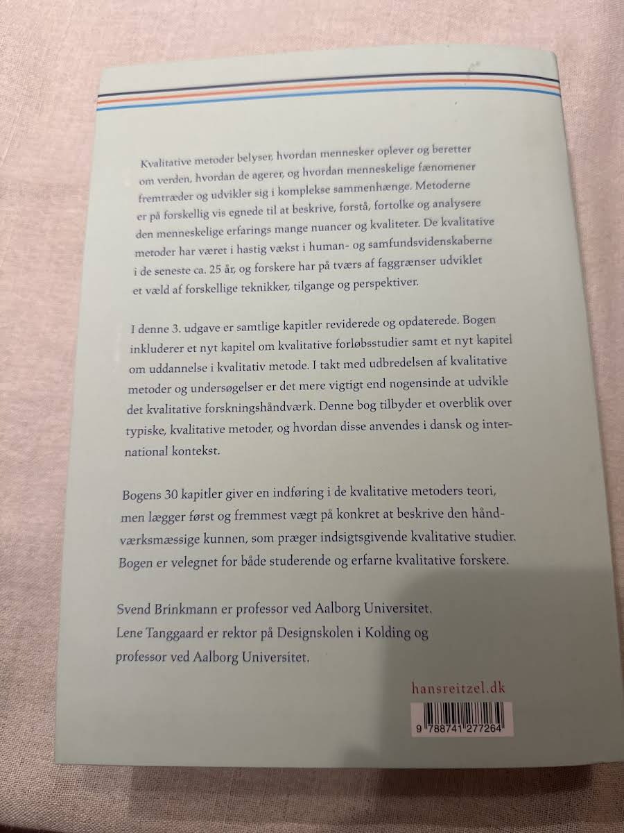 Kvalitative metoder – En grundbog giver en grundlæggende introduktion til, hvordan menneskers oplevelser og fortællinger kan beskrives, forstås og analyseres. Bogen illustrerer, hvordan kvalitative tilgange belyser de mange nuancer i den menneskelige erfarings verden og de komplekse sammenhænge, som præger vores dagligdag. I denne tredje udgave er samtlige kapitler reviderede og opdaterede for at afspejle den hastige udvikling inden for feltet. Blandt de nye tilføjelser finder vi et kapitel om kvalitative forløbsstudier samt et om uddannelse i den kvalitative metode, der understøtter en fornyet forståelse af forskningshåndværket. Med sine 30 kapitler præsenterer bogen både teoretiske perspektiver og praktiske metoder, som gør den til et uundværligt redskab for studerende og erfarne forskere, der ønsker at styrke deres kvalitative arbejdsmetoder.