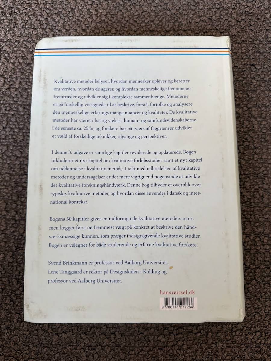 Kvalitative metoder – En grundbog giver en grundlæggende introduktion til, hvordan menneskers oplevelser og fortællinger kan beskrives, forstås og analyseres. Bogen illustrerer, hvordan kvalitative tilgange belyser de mange nuancer i den menneskelige erfarings verden og de komplekse sammenhænge, som præger vores dagligdag. I denne tredje udgave er samtlige kapitler reviderede og opdaterede for at afspejle den hastige udvikling inden for feltet. Blandt de nye tilføjelser finder vi et kapitel om kvalitative forløbsstudier samt et om uddannelse i den kvalitative metode, der understøtter en fornyet forståelse af forskningshåndværket. Med sine 30 kapitler præsenterer bogen både teoretiske perspektiver og praktiske metoder, som gør den til et uundværligt redskab for studerende og erfarne forskere, der ønsker at styrke deres kvalitative arbejdsmetoder.