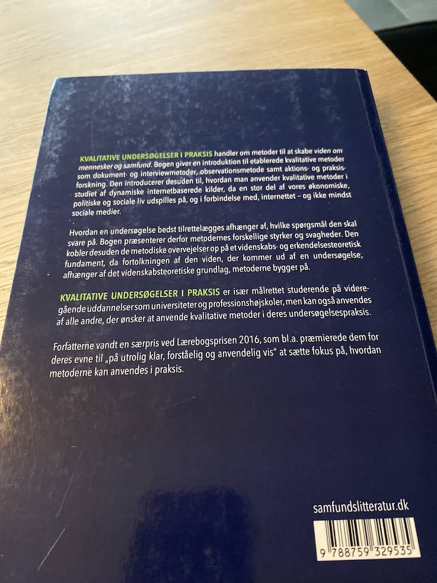 Kvalitative undersøgelser i praksis præsenterer metoder til at skabe viden om mennesker og samfund. Bogen introducerer en række etablerede kvalitative teknikker – fra dokument- og interviewmetoder til observationsmetoder samt aktions- og praksisforskning – med et særligt fokus på, hvordan man kan anvende disse i studiet af de dynamiske, internetbaserede kilder, der præger vores samfund. Bogen belyser, hvordan valget af metode afhænger af undersøgelsens specifikke spørgsmål, og diskuterer nøje de forskellige metoders styrker og svagheder. Samtidig sættes de metodiske overvejelser i spil i et solidt videnskabs- og erkendelsesteoretisk fundament, hvilket sikrer, at fortolkningen af resultaterne får en robust baggrund. Med sin klare og lettilgængelige tilgang henvender bogen sig primært til studerende på videregående uddannelser, men den er også et værdifuldt redskab for alle, der ønsker at anvende kvalitative metoder i deres egen undersøgelsespraksis.