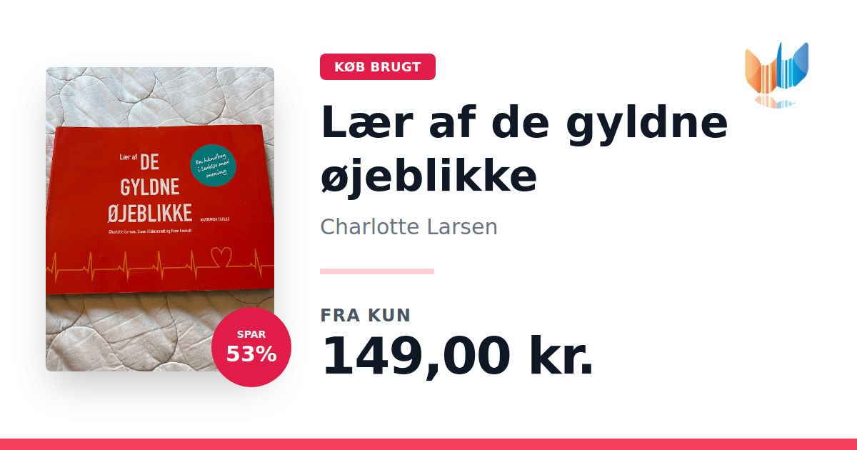 Lige nu kan du købe "Lær af de gyldne øjeblikke" af Charlotte Larsen til kun 149,00 kr. Du sparer hele 53% af nyprisen! Bogen du ser her er brugt, og i god stand. Vi har i øjeblikket 2 eksemplarer til salg af "Lær af de gyldne øjeblikke", så husk at se de forskellige udgaver.