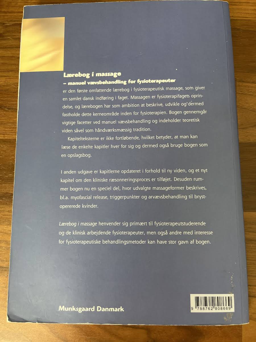 Lærebog i massage – manuel vævsbehandling for fysioterapeuter præsenterer en grundig og opdateret introduktion til terapeutisk massage. I denne anden udgave er indholdet revideret med den nyeste viden og inkluderer et helt nyt kapitel, der giver indsigt i den kliniske ræsonneringsproces, som understøtter beslutninger i det kliniske arbejde. Bogen rummer desuden en særlig sektion, hvor udvalgte massageformer, herunder teknikker som myofascial release, triggerpunkter og arvævsbehandling for brystopererede kvinder, får særlig opmærksomhed. Kapitelstrukturen er udformet således, at de enkelte emner kan læses hver for sig, hvilket giver læseren fleksibilitet og mulighed for at bruge bogen som både en lærebog og et opslagsværk. Lærebogen henvender sig primært til fysioterapeutstuderende og klinisk arbejdende fysioterapeuter, men også andre med interesse for fysioterapeutiske behandlingsmetoder vil få stor gavn af dens indhold.