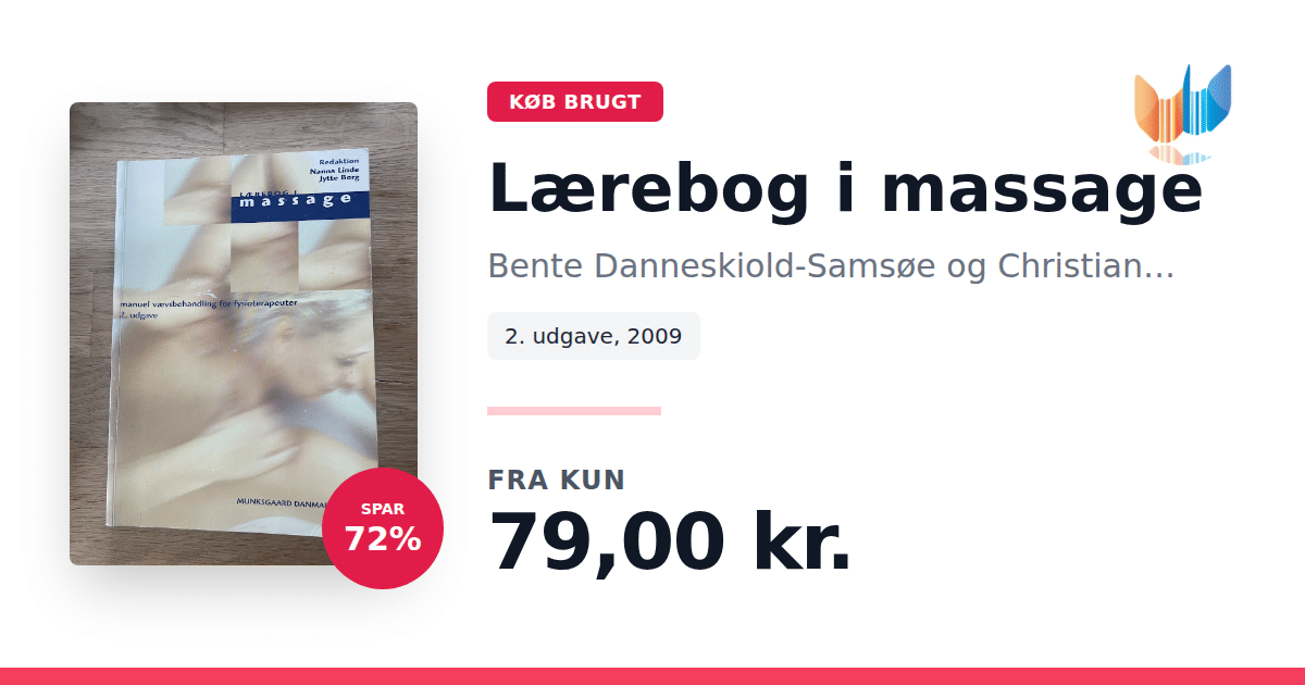 Lige nu kan du købe "Lærebog i massage" af Bente Danneskiold-Samsøe og Christian Neergaard til kun 79,00 kr. Du sparer hele 72% af nyprisen! Bogen du ser her er brugt, og i god stand. Vi har i øjeblikket 4 eksemplarer til salg af "Lærebog i massage", så husk at se de forskellige udgaver.