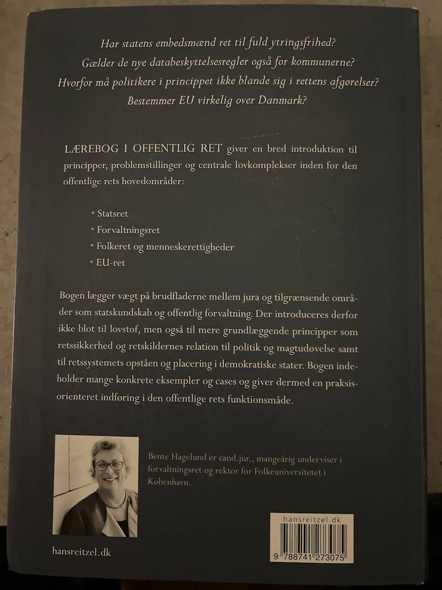 Har statens embedsmænd ret til fuld ytringsfrihed? Hvad er en nødløgn juridisk set? Og må politikere egentlig gribe ind i retsprocesserne? Lærebog i offentlig ret byder på et skarpt og indsigtsfuldt indblik i centrale problemstillinger og lovkomplekser inden for de vigtigste områder af den offentlige ret. Bogen dækker emner som statsret, forvaltningsret – med særligt fokus på persondataregulering efter GDPR og databeskyttelsesloven – samt folkeret, menneskerettigheder og EU-ret. Den lægger stor vægt på samspillet mellem jura, statskundskab og offentlig forvaltning og belyser grundlæggende principper som retssikkerhed, retskildernes betydning og retssystemets plads i demokratiske stater. Med en række konkrete eksempler og cases giver bogen en praksisnær introduktion til offentlig rets funktionsmåde. Den tredje udgave, udgivet i 2018, er opdateret og revideret i alle henseender, bl.a. med en gennemarbejdet behandling af personoplysninger. Bente Hagelund, cand.jur. og mangeårig underviser i forvaltningsret, formidler med denne lærebog både teoretisk dybde og praktisk anvendelighed, hvilket gør den til et uundværligt redskab for studerende og praktikere.