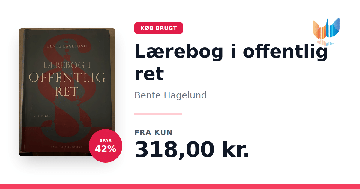 Lige nu kan du købe "Lærebog i offentlig ret" af Bente Hagelund til kun 318,00 kr. Du sparer hele 42% af nyprisen! Bogen du ser her er brugt, og i perfekt stand. Vi har i øjeblikket 2 eksemplarer til salg af "Lærebog i offentlig ret", så husk at se de forskellige udgaver.