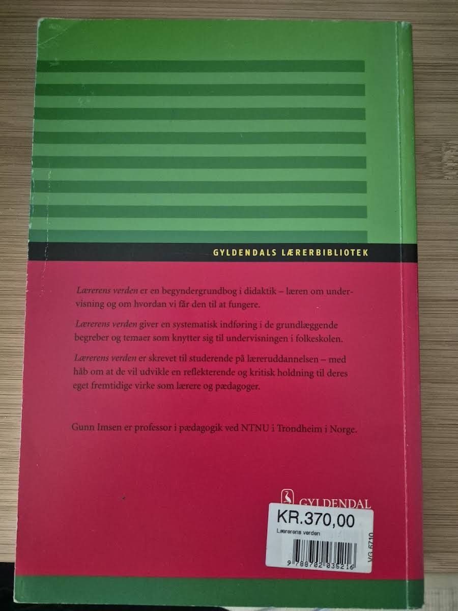 Lærerens verden af Gunn Imsen byder på en grundig og systematisk indføring i de centrale begreber og temaer inden for undervisning i folkeskolen. Bogen er udarbejdet med henblik på at give lærerstuderende et solidt teoretisk fundament og et dybere indblik i almen didaktik. Med et klart og struktureret indhold præsenteres komplekse didaktiske emner på en tilgængelig måde, der gør stoffet let forståeligt og anvendeligt i det pædagogiske virke. Udgivet af Gyldendal i 2004 og omfangende 460 sider, er Lærerens verden et væsentligt redskab for alle, der ønsker at forstå og udvikle praksis i undervisningen.