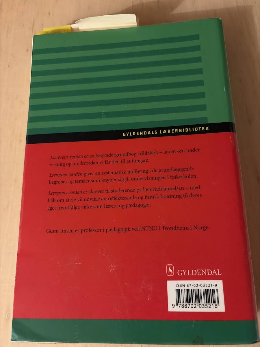 Lærerens verden af Gunn Imsen byder på en grundig og systematisk indføring i de centrale begreber og temaer inden for undervisning i folkeskolen. Bogen er udarbejdet med henblik på at give lærerstuderende et solidt teoretisk fundament og et dybere indblik i almen didaktik. Med et klart og struktureret indhold præsenteres komplekse didaktiske emner på en tilgængelig måde, der gør stoffet let forståeligt og anvendeligt i det pædagogiske virke. Udgivet af Gyldendal i 2004 og omfangende 460 sider, er Lærerens verden et væsentligt redskab for alle, der ønsker at forstå og udvikle praksis i undervisningen.