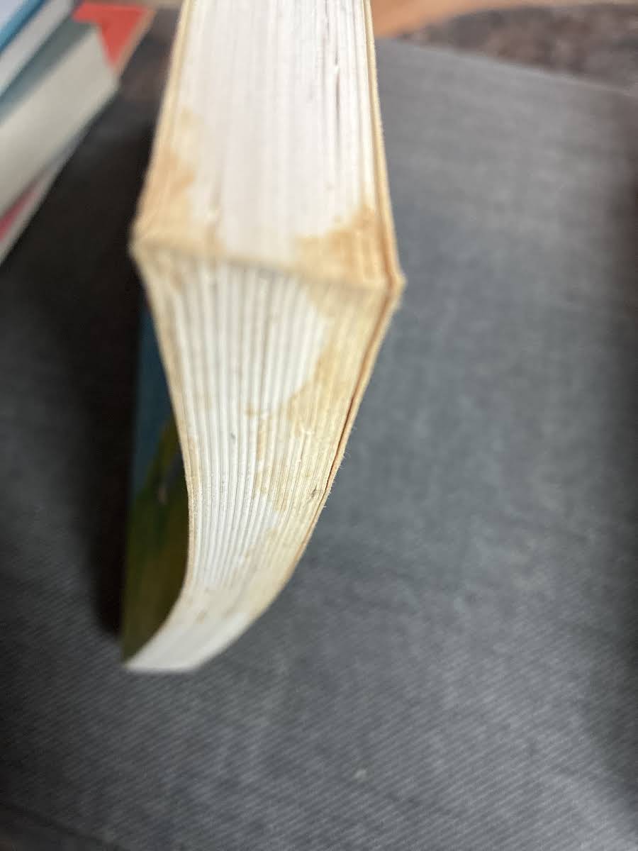 Vand på inderside, overstregning og spilt kaffe. Alt er læsbart og ingen løse sider.