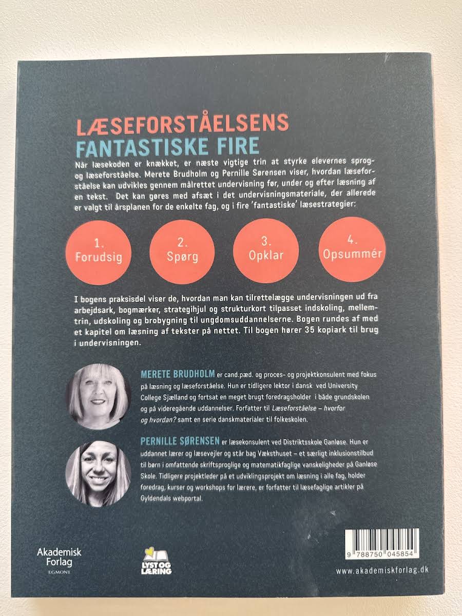 I "Læseforståelsens fantastiske fire" præsenterer Merete Brudholm og Pernille Sørensen en målrettet metode til at styrke elevers sprog- og læseforståelse. Bogens kerne bygger på fire essentielle læsestrategier, hvor arbejdet med at forudsige, spørge, opklare og opsummere en tekst bliver omsat til praktisk undervisningsmateriale, som kan tilpasses indskoling, mellemtrin og udskoling. Med et væld af konkrete eksempler og undervisningsredskaber som arbejdsark, bogmærker og strukturkort giver bogen lærere et solidt fundament til at integrere læseforståelsesstrategier i den daglige undervisning. Et oplagt redskab til at støtte elevernes fortsatte sproglige udvikling og engagement med både trykte og digitale tekster.