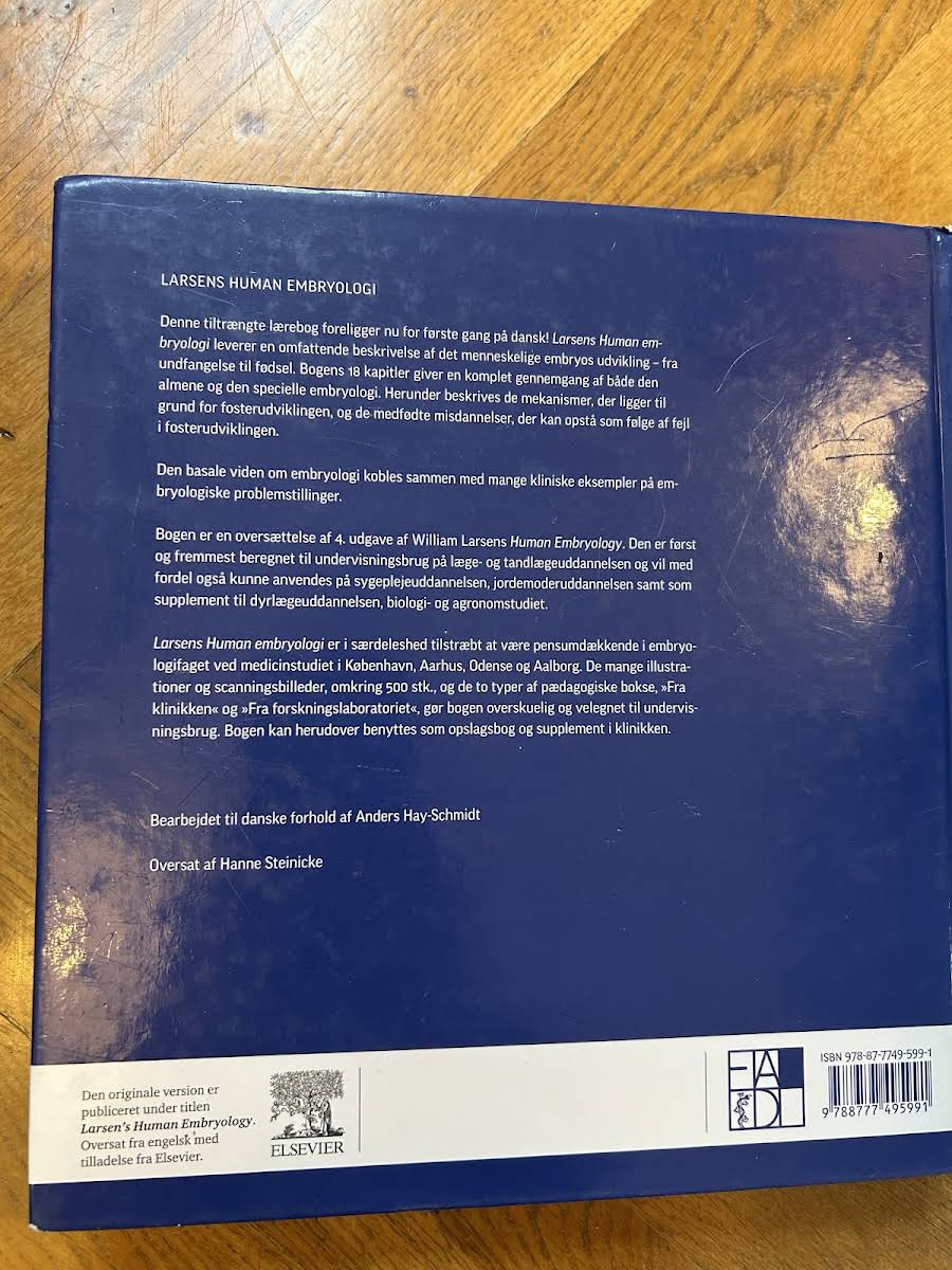 Denne lærebog tilbyder nu en første dansk udgave af Larsens Human embryologi og præsenterer en grundig gennemgang af udviklingen af det menneskelige embryo – lige fra undfangelsen til fødslen. Med et solidt fundament inden for deskriptiv, klinisk, genetisk og molekylær biologi kombineres basale embryologiske principper med illustrative kliniske eksempler, der illustrerer embryologiske problemstillinger. Bogen indeholder et væld af illustrationer og fotografier, som gør komplekse emner lettere tilgængelige og forståelige. Denne udgave af Larsens Human embryologi er en essentiel ressource, der dækker det nødvendige pensum for medicinstudiet og tjener som et uundværligt værktøj både for studerende og fagfolk.