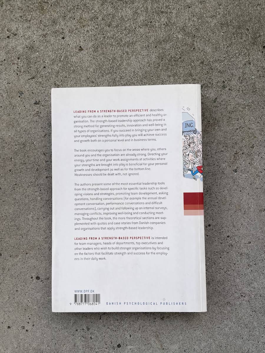 Engelsk udgave af Styrkebaseret ledelse - Konkrete redskaber til at skabe effektive og sunde organisationer, ISBN 978-87-7706-804-1 (Dansk Psykologisk 2012). Leading from a Strength-Based Perspective beskriver, hvordan du som leder kan fremme en både effektiv og sund organisation gennem et styrkebaseret ledelsesparadigme. Styrkebaseret ledelse har vist sig som en stærk metode til at skabe resultater, innovation og trivsel i alle typer organisationer. Når du får dine egne og medarbejdernes styrker fuldt i spil, opstår både personlig udvikling og forretningsmæssig vækst. Bogen guider dig til at fokusere din energi, din tid og dine opgaver mod de områder, hvor I allerede har styrke, og til at håndtere svagheder målrettet - uden at lade dem overskygge jeres kernekvaliteter. Bogen er tiltænkt teamledere, afdelingschefer, topledere og andre beslutningstagere, der ønsker at opbygge stærkere organisationer ved konsekvent at satse på de faktorer, der skaber styrke og succes i medarbejdernes daglige arbejde.