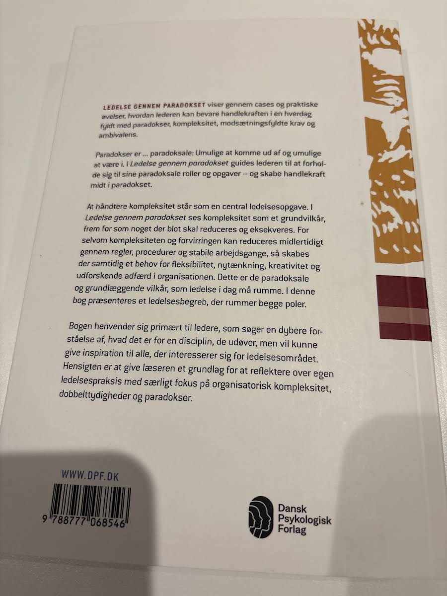 I Ledelse gennem paradokset udforsker Lotte S. Lüscher, erhvervspsykolog med en PhD i ledelse, hvordan to tilsyneladende modstridende ledelsesparadigmer – den moderne, direktiv orienterede tilgang og den postmoderne, medinddragende og coachende tilgang – kan forenes til ét sammenhængende begreb. Med udgangspunkt i erfaring fra både private og offentlige virksomheder tilbyder bogen en praksisnær tilgang, der afspejler den komplekse virkelighed, dagens ledere møder. Bogen præsenterer paradoksledelse som et redskab, der hjælper ledere og ledergrupper med at bevare handlekraft i mødet med organisatorisk kompleksitet og uoverskuelige problemstillinger. Gennem en række konkrete eksempler og cases illustrerer Lüscher, hvordan integrationen af begge paradigmer kan skabe en mere dynamisk og fleksibel ledelsespraksis. Ledelse gennem paradokset henvender sig til dem, der søger en dybere forståelse af det moderne lederfag og ønsker inspiration til at navigere i en foranderlig verden.