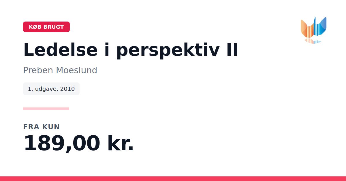 Lige nu kan du købe "Ledelse i perspektiv II" af Preben Moeslund til kun 189,00 kr. Bogen du ser her er brugt, og i god stand. Vi har i øjeblikket 4 eksemplarer til salg af "Ledelse i perspektiv II", så husk at se de forskellige udgaver.