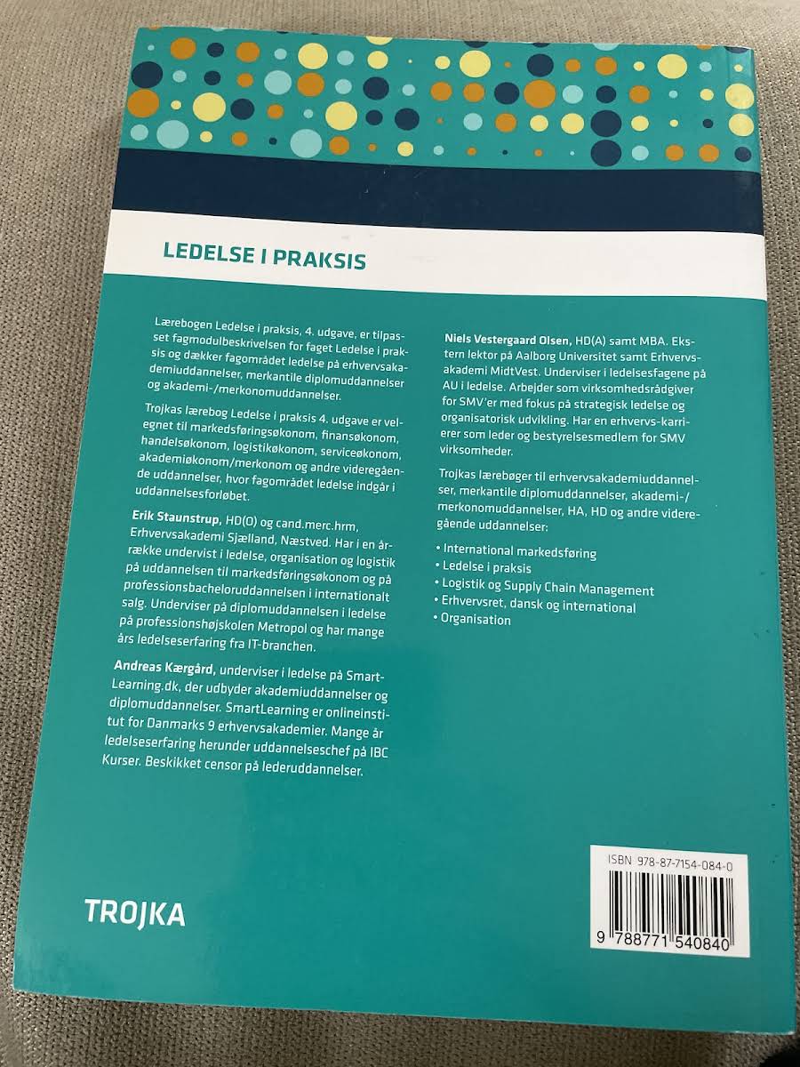 Lærebogen Ledelse i praksis, 4. udgave, forfattet af Niels Vestergaard Olsen, er nøje tilpasset den aktuelle fagmodulbeskrivelse for faget. Bogen dækker de centrale aspekter af ledelse, der er relevante for uddannelser som erhvervsakademiuddannelser, merkantile diplomuddannelser samt akademi- og merkonomuddannelser. Undervisningsmaterialet indeholder både den trykte lærebog og supplerende e-læringsmaterialer på bogens dedikerede website. Denne kombination af ressourcer er udviklet af Trojka for at understøtte studerendes forståelse af ledelsesprincipper og praktiske anvendelse i en moderne kontekst.