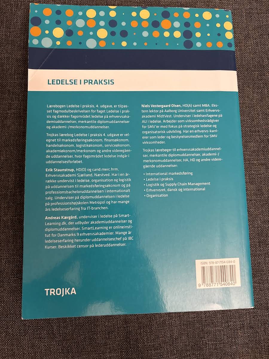Lærebogen Ledelse i praksis, 4. udgave, forfattet af Niels Vestergaard Olsen, er nøje tilpasset den aktuelle fagmodulbeskrivelse for faget. Bogen dækker de centrale aspekter af ledelse, der er relevante for uddannelser som erhvervsakademiuddannelser, merkantile diplomuddannelser samt akademi- og merkonomuddannelser. Undervisningsmaterialet indeholder både den trykte lærebog og supplerende e-læringsmaterialer på bogens dedikerede website. Denne kombination af ressourcer er udviklet af Trojka for at understøtte studerendes forståelse af ledelsesprincipper og praktiske anvendelse i en moderne kontekst.