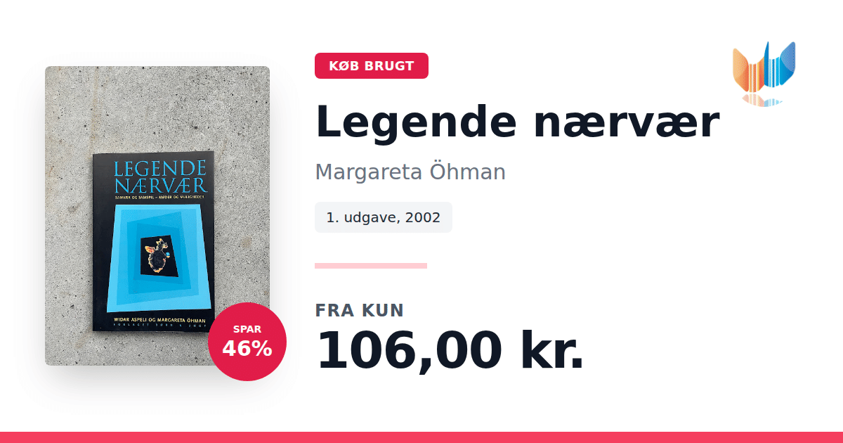 Lige nu kan du købe "Legende nærvær" af Margareta Öhman til kun 106,00 kr. Du sparer hele 46% af nyprisen! Bogen du ser her er brugt, og i perfekt stand. Vi har i øjeblikket kun et enkelt eksemplar til salg af "Legende nærvær", så slå til mens du kan!