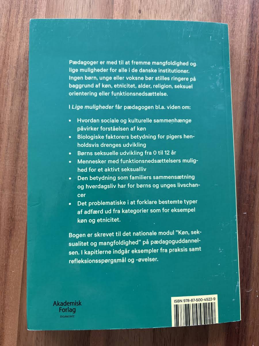 Lige muligheder er en faglig bog, der giver pædagoger indsigt i, hvordan rammer og kulturelle kontekster påvirker arbejdet med mangfoldighed og lige muligheder i institutionerne. Bogen belyser sociale og biologiske faktorers betydning for udviklingen hos både piger og drenge samt børns seksuelle udvikling fra 0 til 12 år. Med konkrete eksempler fra praksis og refleksionsøvelser giver bogen redskaber til at forstå, hvordan forskellige familiemønstre og hverdagslivets struktur former børns og unges livschancer. Den drøfter desuden, hvordan man undgår at vælge simplistic kategoriseringer som køn og etnicitet til at forklare bestemte adfærdsmønstre. Lige muligheder er udarbejdet til det nationale modul "Køn, seksualitet og mangfoldighed" på pædagoguddannelsen og er et værdifuldt redskab i arbejdet med ligestilling og diversitet.