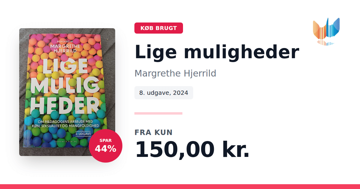 Lige nu kan du købe "Lige muligheder" af Margrethe Hjerrild til kun 150,00 kr. Du sparer hele 44% af nyprisen! Bogen du ser her er brugt, og i perfekt stand. Vi har i øjeblikket 2 eksemplarer til salg af "Lige muligheder", så husk at se de forskellige udgaver.