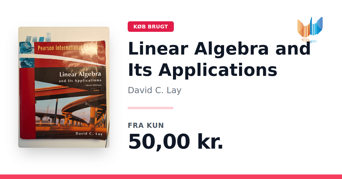 Linear Algebra and Its Applications af David C. Lay (2006) er en 576-siders paperback på engelsk, der præsenterer lineær algebra og dens mange praktiske anvendelser. Bogen leveres med en CD-ROM, som indeholder en grundig studieguide, en introduktion til brug af teknologiske redskaber, datafiler til download, nye MATLAB-projekter samt PDF-dokumenter med supplerende materialer.