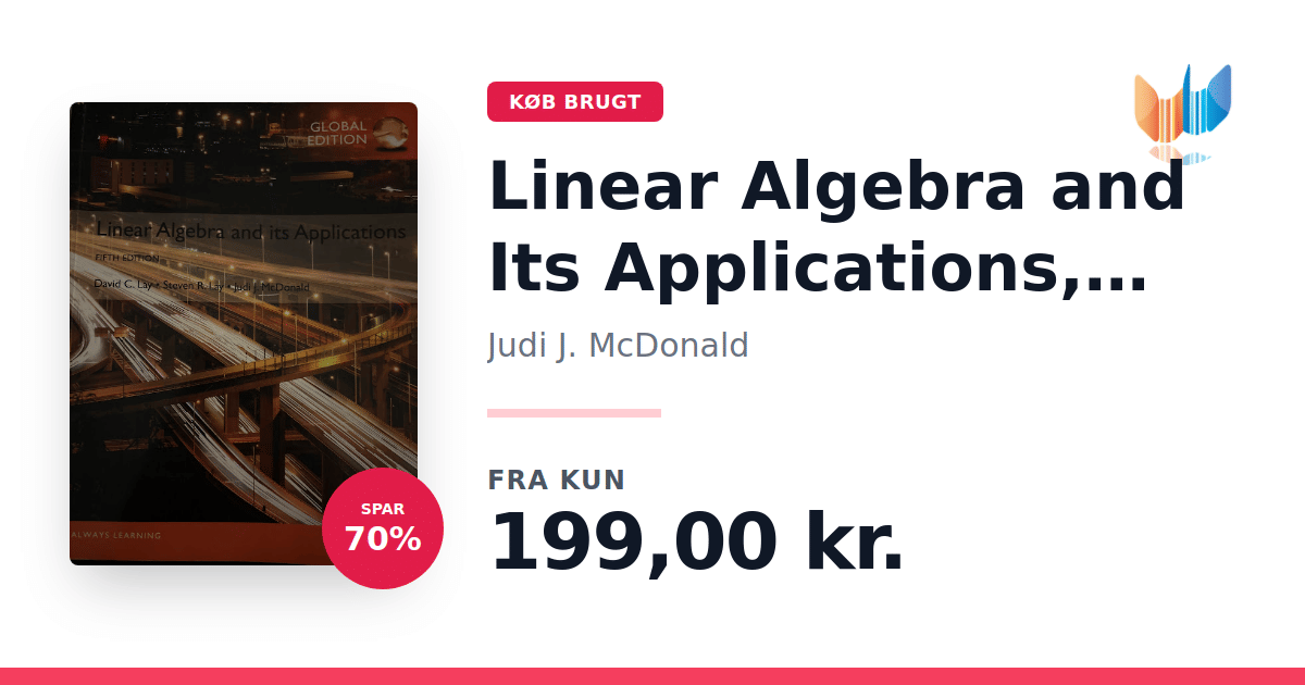 Linear Algebra and Its Applications, Global Edition er den anerkendte 5. udgave (2015) af David Lay, Steven Lay og Judi McDonald. Med sine 576 sider giver bogen en grundig, men tilgængelig indføring i lineær algebraens kernebegreber og metoder - fra matrixregning og determinanter til egenværdier og diagonaliseringsprocesser. I stedet for at springe direkte til abstrakte definitioner præsenteres de mest udfordrende emner - som lineær uafhængighed, spans, underrum, vektorrum og lineære transformationer - først i det velkendte Rⁿ. Her bygges forståelsen systematisk op og styrkes gennem tilbagevendende eksempler, så overgangen til mere generelle og teoretiske rammer bliver naturlig og overskuelig. Denne globale udgave er skræddersyet til universitetskurser i lineær algebra og kombinerer klar pædagogik med et væld af øvelser og illustrative figurer. Både studerende og undervisere får med dette værk et solidt fundament til at mestre de centrale teorier og anvendelser inden for faget.