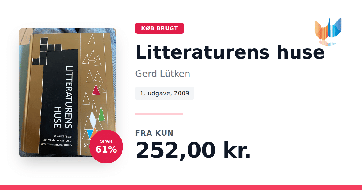 Lige nu kan du købe "Litteraturens huse" af Gerd Lütken til kun 252,00 kr. Du sparer hele 61% af nyprisen! Bogen du ser her er brugt, og i perfekt stand. Vi har i øjeblikket 2 eksemplarer til salg af "Litteraturens huse", så husk at se de forskellige udgaver.
