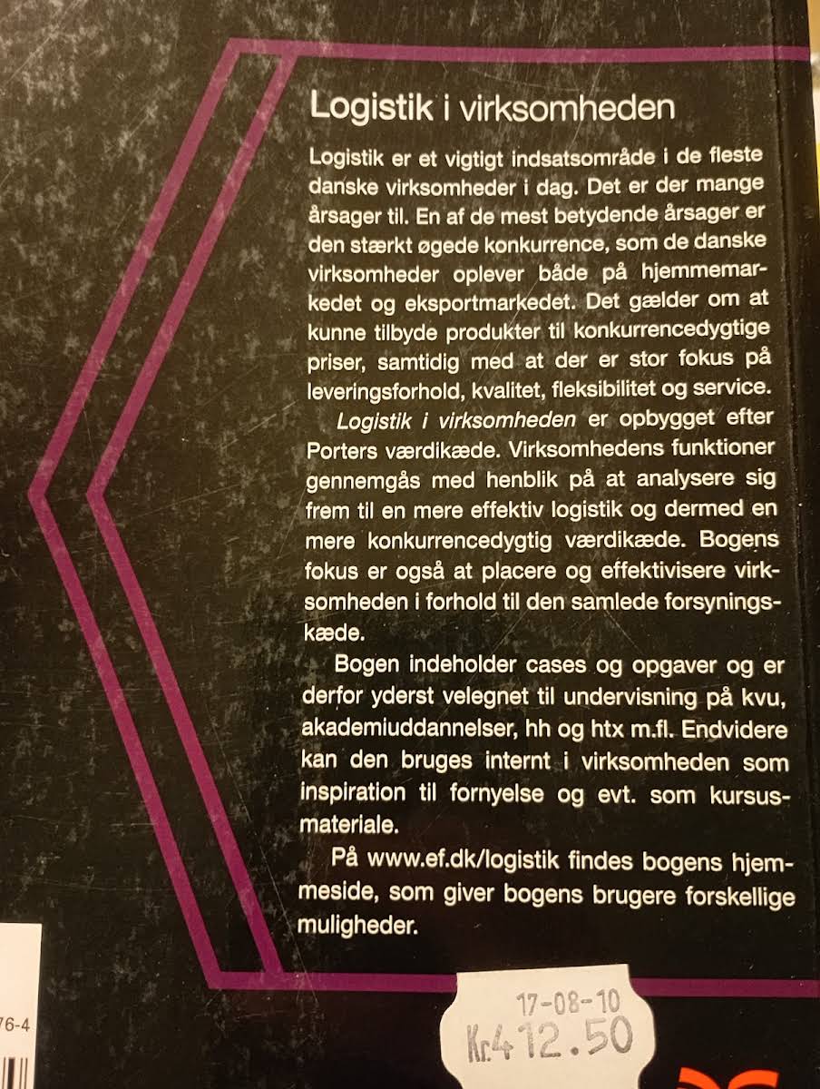 Lige nu kan du købe "Logistik i virksomheden" af Tina Holck og Lisbeth Jensen til kun 170,00 kr. Bogen du ser her er brugt, og i god stand. Vi har i øjeblikket 2 eksemplarer til salg af "Logistik i virksomheden", så husk at se de forskellige udgaver.