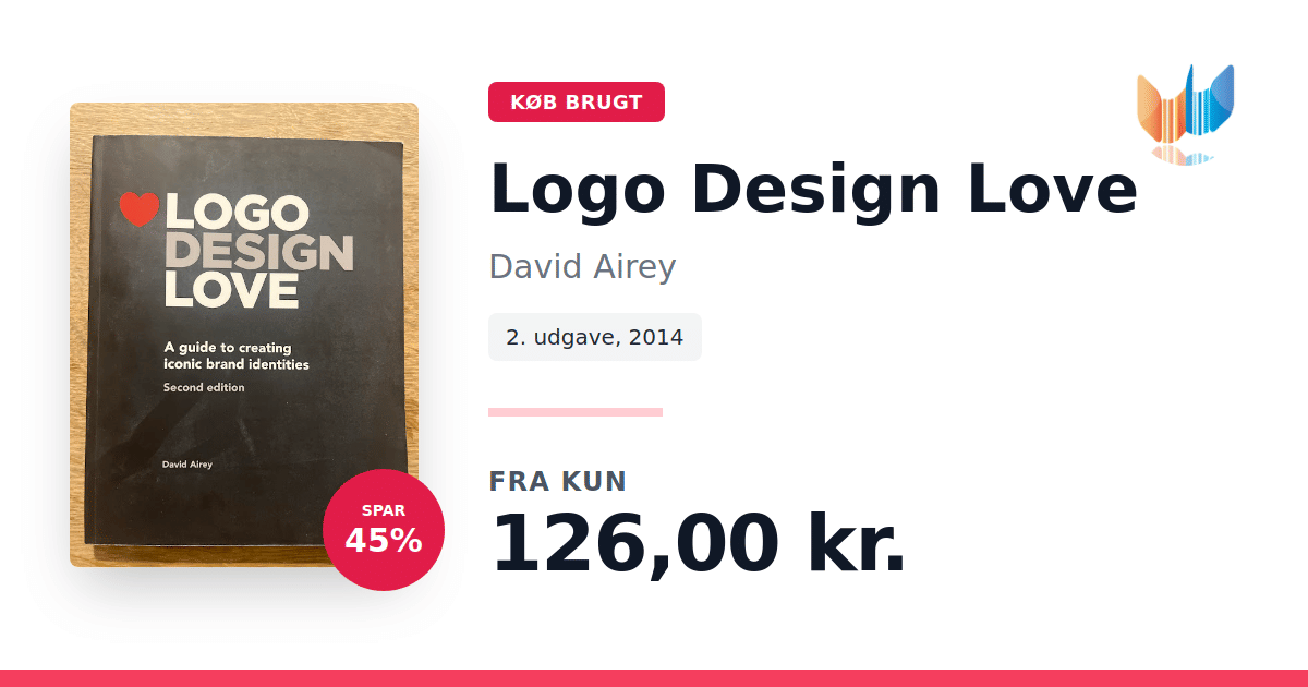 Lige nu kan du købe "Logo Design Love" af David Airey til kun 126,00 kr. Du sparer hele 45% af nyprisen! Bogen du ser her er brugt, og i perfekt stand. Vi har i øjeblikket kun et enkelt eksemplar til salg af "Logo Design Love", så slå til mens du kan!