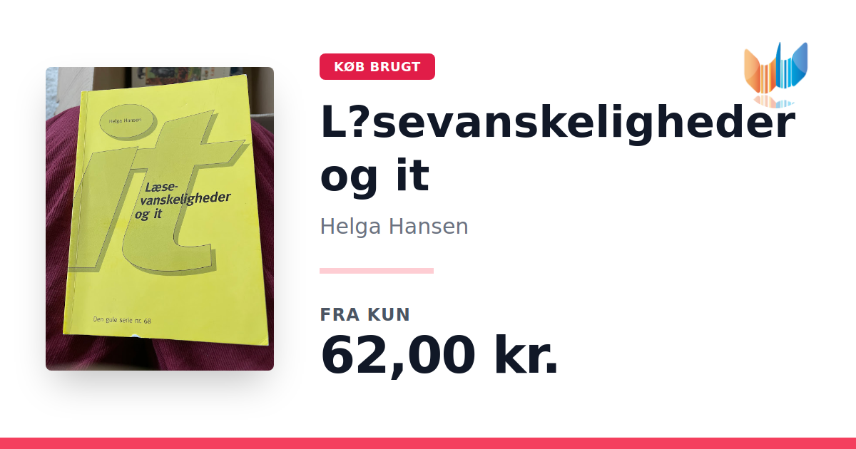 Lige nu kan du købe "L?sevanskeligheder og it" af Helga Hansen til kun 62,00 kr. Bogen du ser her er brugt, og i god stand. Vi har i øjeblikket kun et enkelt eksemplar til salg af "L?sevanskeligheder og it", så slå til mens du kan!
