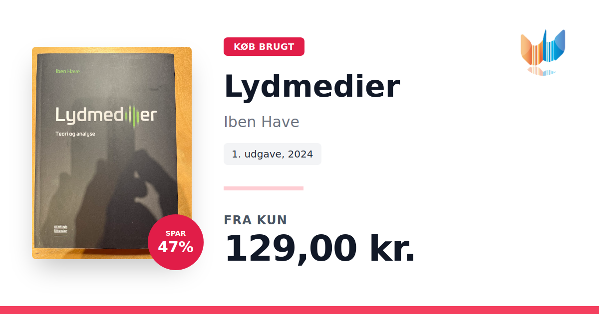 Lige nu kan du købe "Lydmedier" af Iben Have til kun 129,00 kr. Du sparer hele 47% af nyprisen! Bogen du ser her er brugt, og i perfekt stand. Vi har i øjeblikket 2 eksemplarer til salg af "Lydmedier", så husk at se de forskellige udgaver.