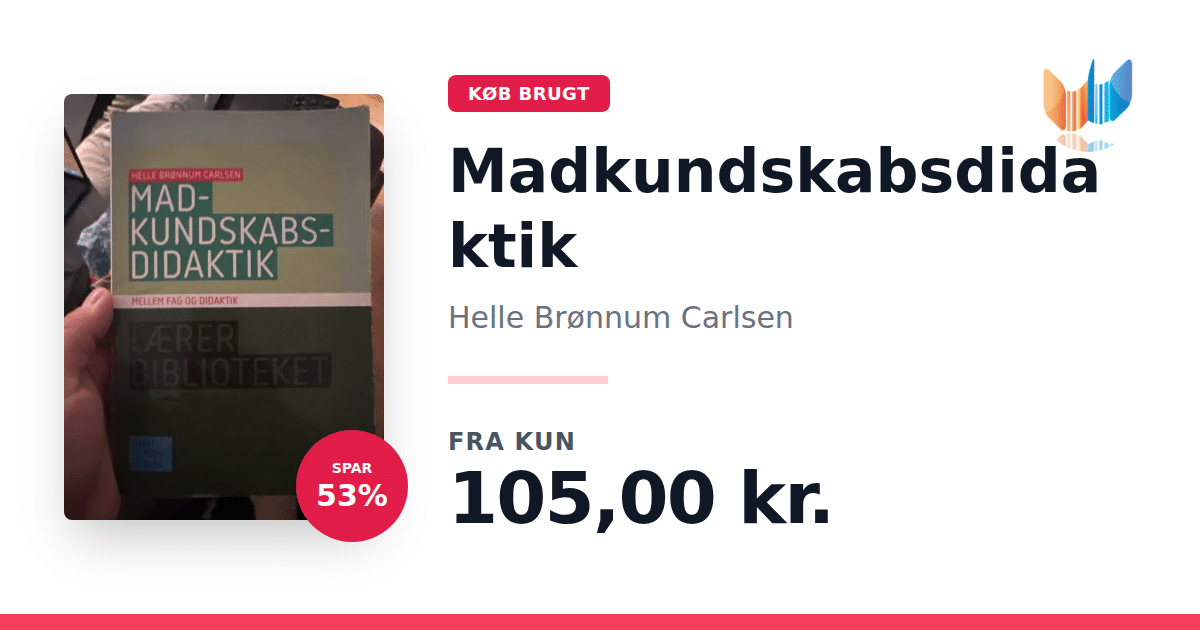 Lige nu kan du købe "Madkundskabsdidaktik" af Helle Brønnum Carlsen til kun 105,00 kr. Du sparer hele 53% af nyprisen! Bogen du ser her er brugt, og i god stand. Vi har i øjeblikket 2 eksemplarer til salg af "Madkundskabsdidaktik", så husk at se de forskellige udgaver.
