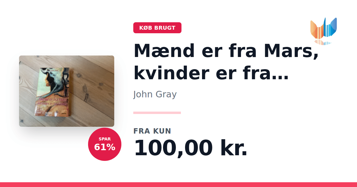 Lige nu kan du købe "Mænd er fra Mars, kvinder er fra Venus" af John Gray til kun 100,00 kr. Du sparer hele 61% af nyprisen! Bogen du ser her er brugt, og i perfekt stand. Vi har i øjeblikket kun et enkelt eksemplar til salg af "Mænd er fra Mars, kvinder er fra Venus", så slå til mens du kan!