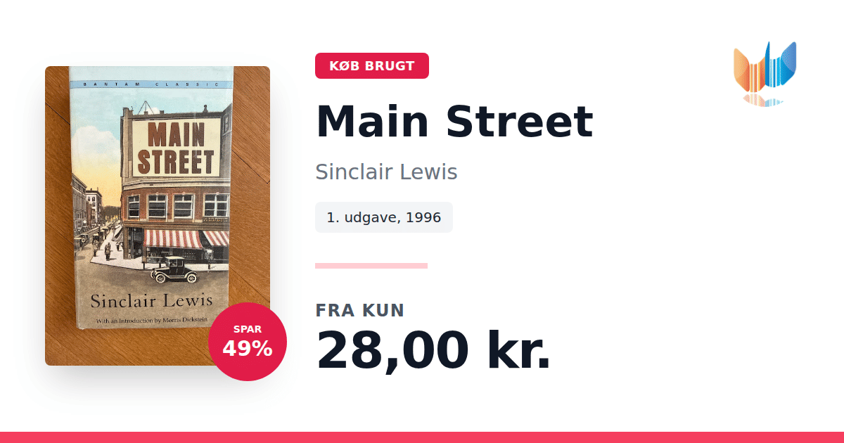 Lige nu kan du købe "Main Street" af Sinclair Lewis til kun 28,00 kr. Du sparer hele 49% af nyprisen! Bogen du ser her er brugt, og i perfekt stand. Vi har i øjeblikket kun et enkelt eksemplar til salg af "Main Street", så slå til mens du kan!