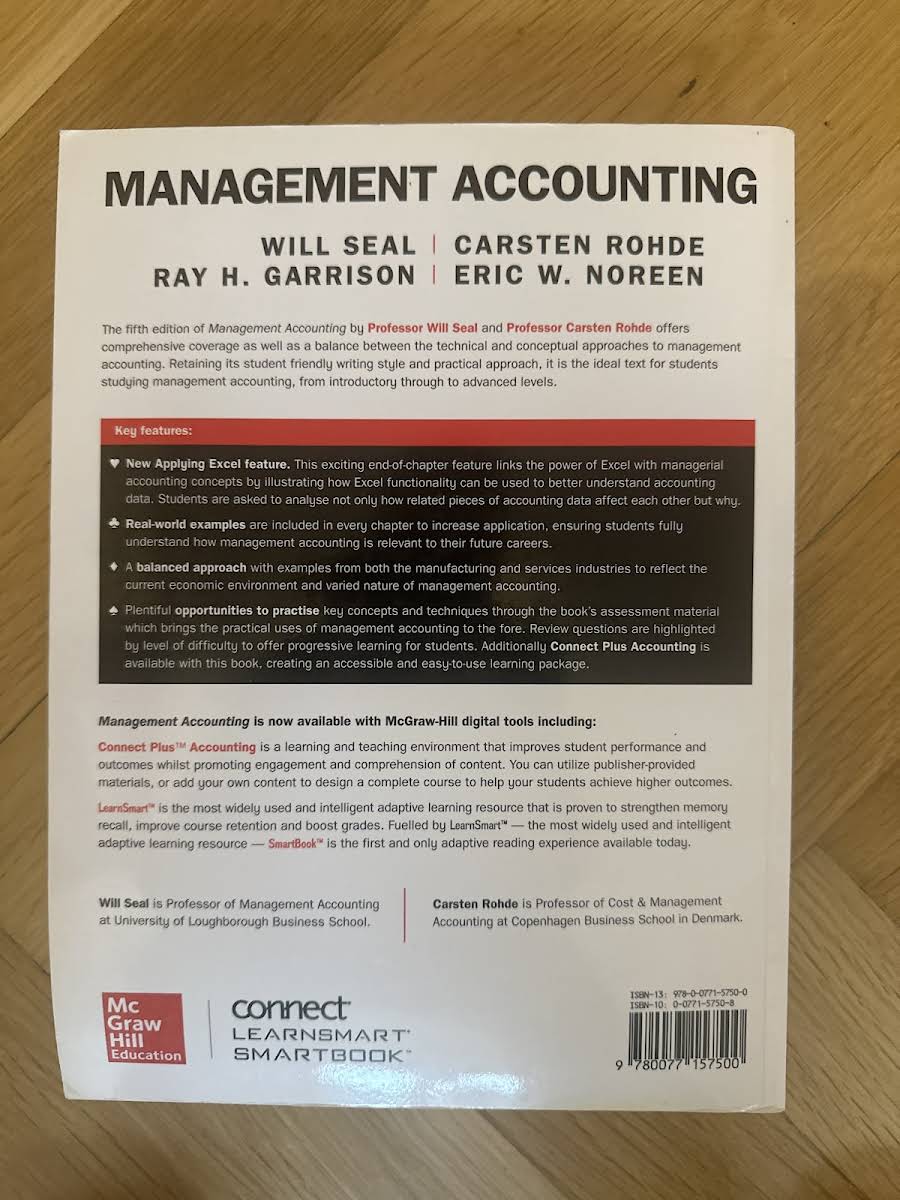 Management Accounting giver en grundig indføring i ledelsesregnskabets teorier og metoder og viser, hvordan de kan anvendes i praksis. Bogen er skrevet af Carsten Rohde, Ray H. Garrison, Eric W. Noreen og Will Seal og bygger på den seneste forskning inden for faget. Velegnet til både studerende og praktikere, præsenterer teksten klare forklaringer, illustrative eksempler og cases, der understøtter forståelsen af komplekse beslutningsprocesser. Udgivet af McGraw-Hill Education i 2014, kombinerer den stringent teori med praktiske værktøjer til analyse og styring af virksomhedens økonomi.