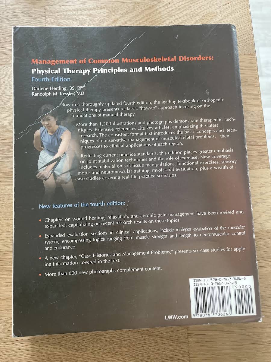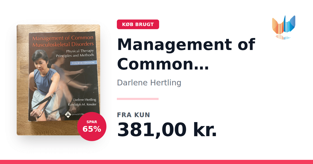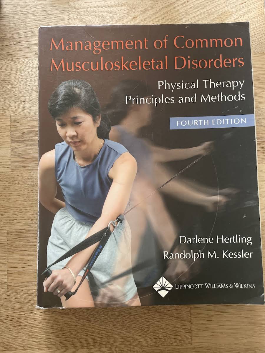 Management of Common Musculoskeletal Disorders: Physical Therapy Principles and Methods af Darlene Hertling fra 2005 er et grundlæggende læremiddel inden for muskuloskeletal fysioterapi. Bogen præsenterer en praktisk "how-to" tilgang, der bygger på solide principper for manuel terapi og kliniske metoder. Med sine 960 sider giver teksten en omfattende gennemgang af diagnostik og behandlingsstrategier, understøttet af detaljerede illustrationer og fotografier af terapeutiske teknikker. Grundige referencer til væsentlige studier sikrer, at læseren får indsigt i den nyeste forskning og evidensbaserede fremgangsmåder. Der lægges særlig vægt på ledstabilisering og funktionelle øvelser som centrale elementer i genoptræning. Nyt materiale om bløddelsmanipulation og myofascial evaluering udvider behandlerens redskaber til at håndtere komplekse tilfælde. Casestudier med autentiske kliniske scenarier giver et realistisk indblik i behandlingsprocessen fra vurdering til opfølgning. Dette værk er uundværligt for fysioterapeuter, der ønsker at styrke deres viden og færdigheder inden for muskuloskeletale lidelser.