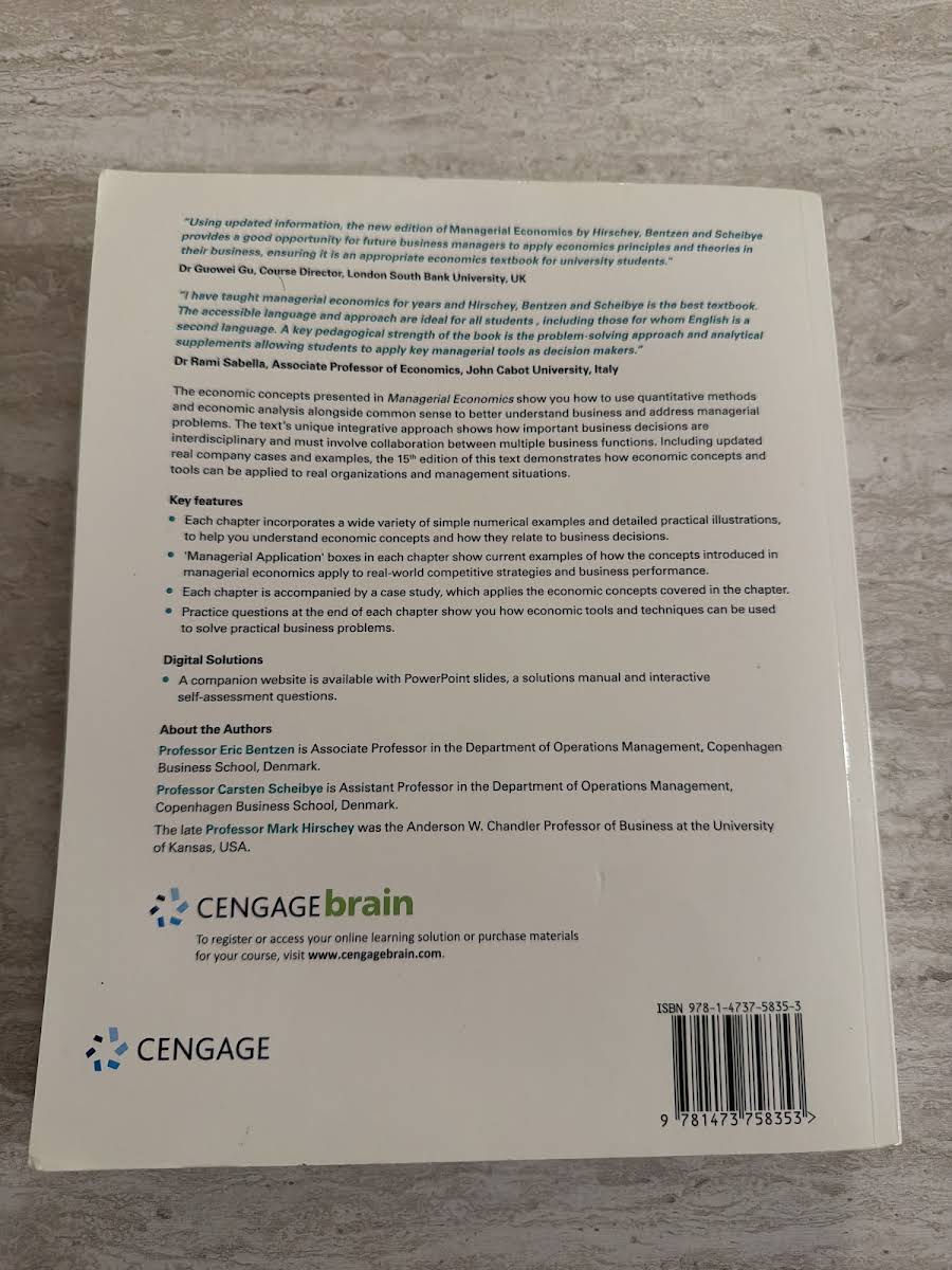 Managerial Economics, 15. udgave (2019) af Mark Hirschey, Eric Bentzen og Carsten Scheibye giver studerende de redskaber, der skal til for at kombinere økonomisk teori og kvantitative metoder med praktisk dømmekraft. Gennem klar fremstilling og eksempler demonstreres, hvordan man kan analysere og løse ledelsesrelaterede problemstillinger ved hjælp af økonomiske modeller. Bogens integrative tilgang understreger, at vigtige beslutninger i virksomheder sjældent træffes isoleret. Ved at inddrage perspektiver fra flere forretningsfunktioner viser teksten, hvordan samarbejde på tværs af afdelinger styrker både analyse og implementering af strategier. Med opdaterede cases fra rigtige virksomheder og relevante eksempler illustreres det, hvordan teorierne omsættes til praksis i nutidige organisations- og ledelsessituationer. Denne udgave klæder læseren på til at anvende økonomiske værktøjer i komplekse, virkelige kontekster.
