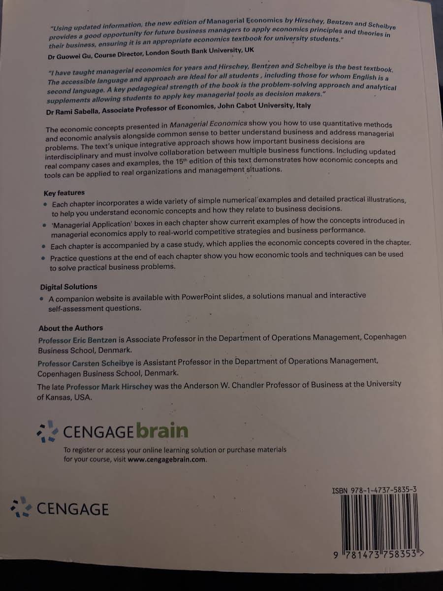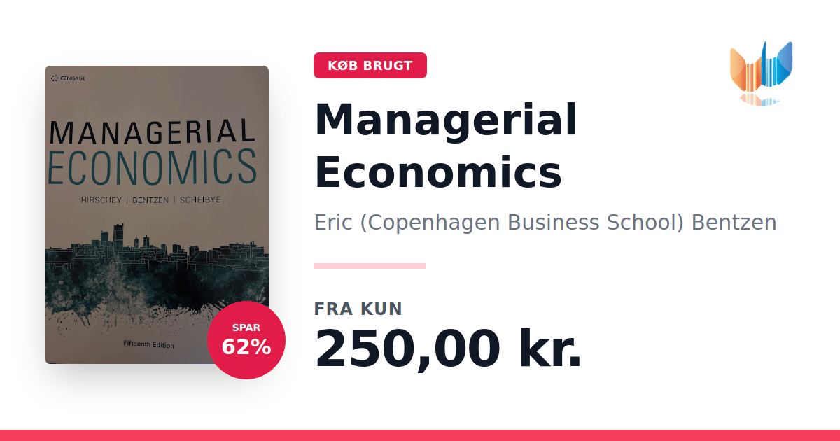 Managerial Economics, 15. udgave (2019) af Mark Hirschey, Eric Bentzen og Carsten Scheibye giver studerende de redskaber, der skal til for at kombinere økonomisk teori og kvantitative metoder med praktisk dømmekraft. Gennem klar fremstilling og eksempler demonstreres, hvordan man kan analysere og løse ledelsesrelaterede problemstillinger ved hjælp af økonomiske modeller. Bogens integrative tilgang understreger, at vigtige beslutninger i virksomheder sjældent træffes isoleret. Ved at inddrage perspektiver fra flere forretningsfunktioner viser teksten, hvordan samarbejde på tværs af afdelinger styrker både analyse og implementering af strategier. Med opdaterede cases fra rigtige virksomheder og relevante eksempler illustreres det, hvordan teorierne omsættes til praksis i nutidige organisations- og ledelsessituationer. Denne udgave klæder læseren på til at anvende økonomiske værktøjer i komplekse, virkelige kontekster.