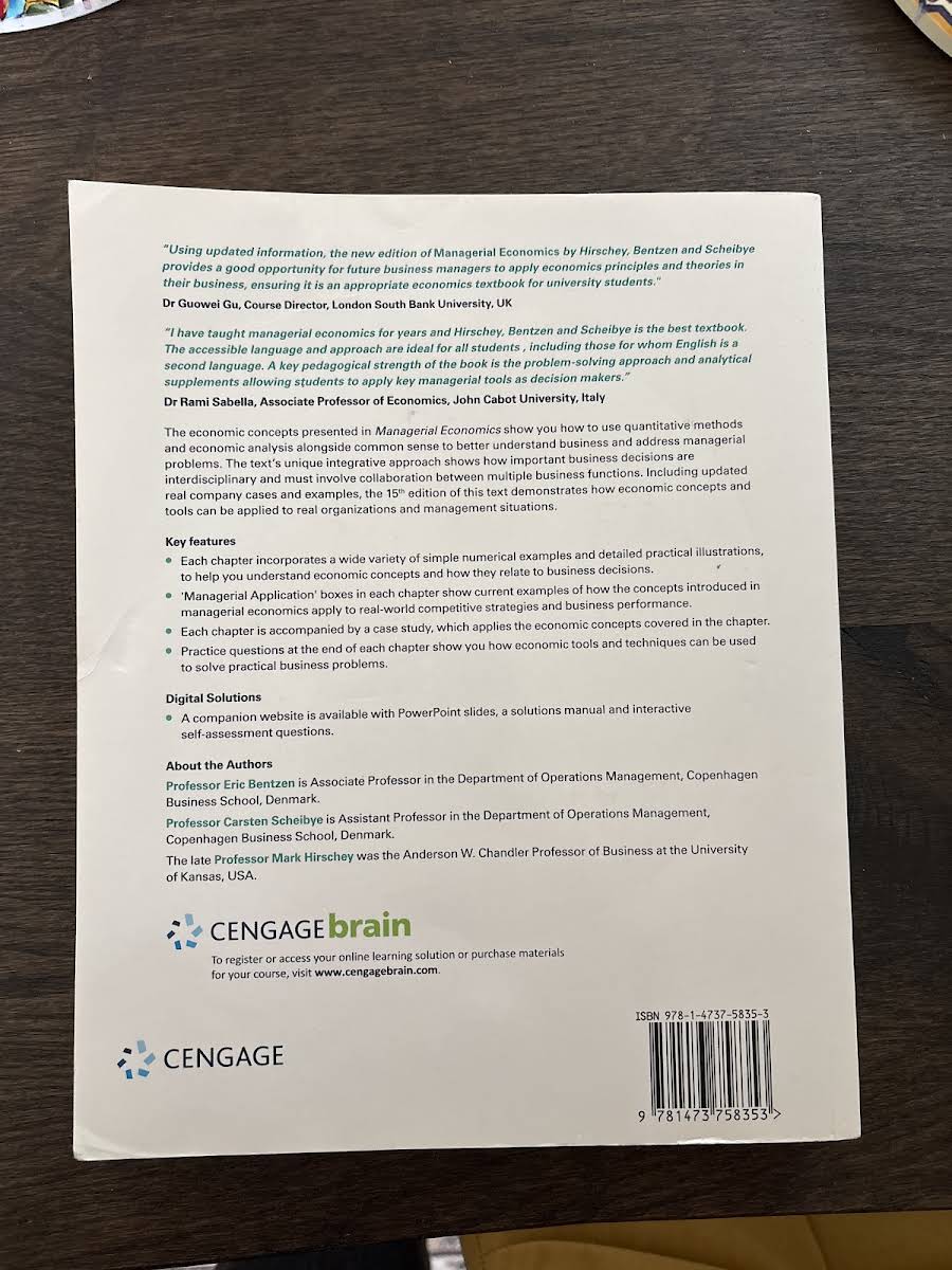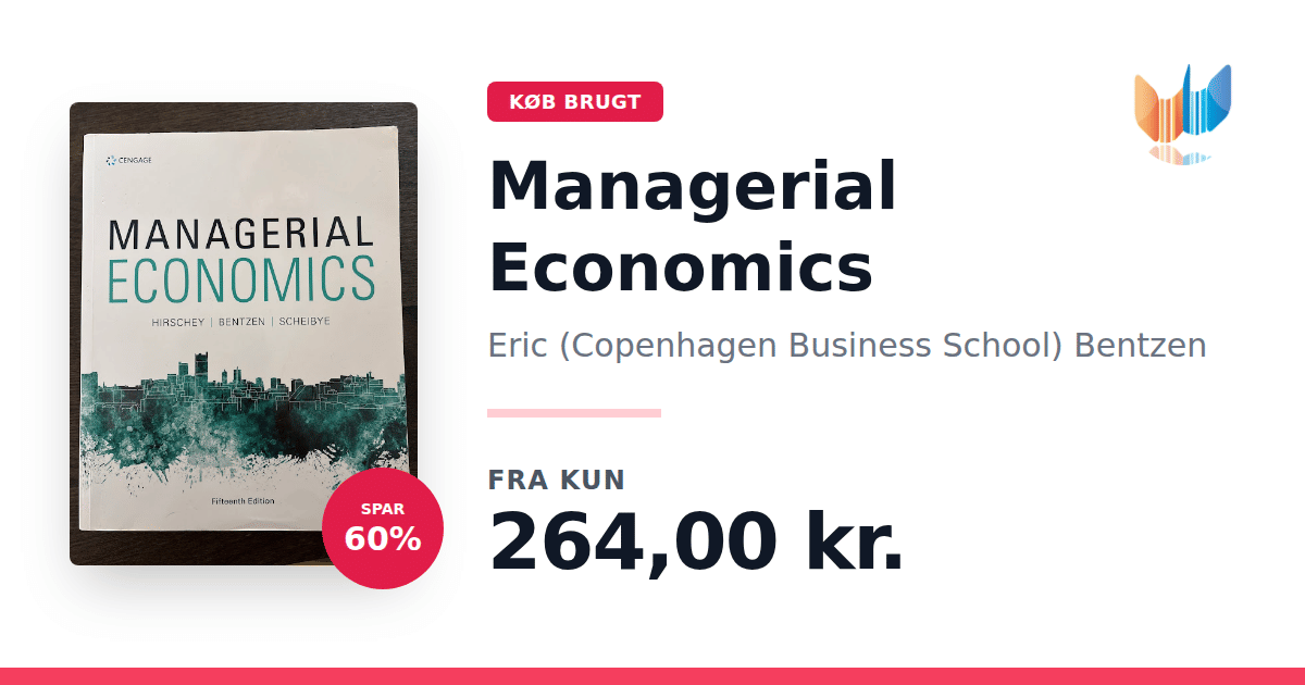 Managerial Economics, 15. udgave (2019) af Mark Hirschey, Eric Bentzen og Carsten Scheibye giver studerende de redskaber, der skal til for at kombinere økonomisk teori og kvantitative metoder med praktisk dømmekraft. Gennem klar fremstilling og eksempler demonstreres, hvordan man kan analysere og løse ledelsesrelaterede problemstillinger ved hjælp af økonomiske modeller. Bogens integrative tilgang understreger, at vigtige beslutninger i virksomheder sjældent træffes isoleret. Ved at inddrage perspektiver fra flere forretningsfunktioner viser teksten, hvordan samarbejde på tværs af afdelinger styrker både analyse og implementering af strategier. Med opdaterede cases fra rigtige virksomheder og relevante eksempler illustreres det, hvordan teorierne omsættes til praksis i nutidige organisations- og ledelsessituationer. Denne udgave klæder læseren på til at anvende økonomiske værktøjer i komplekse, virkelige kontekster.