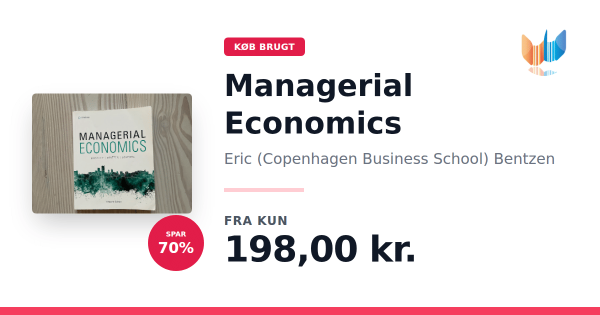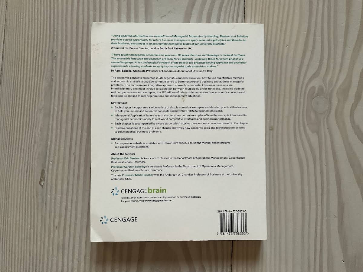 Managerial Economics, 15. udgave (2019) af Mark Hirschey, Eric Bentzen og Carsten Scheibye giver studerende de redskaber, der skal til for at kombinere økonomisk teori og kvantitative metoder med praktisk dømmekraft. Gennem klar fremstilling og eksempler demonstreres, hvordan man kan analysere og løse ledelsesrelaterede problemstillinger ved hjælp af økonomiske modeller. Bogens integrative tilgang understreger, at vigtige beslutninger i virksomheder sjældent træffes isoleret. Ved at inddrage perspektiver fra flere forretningsfunktioner viser teksten, hvordan samarbejde på tværs af afdelinger styrker både analyse og implementering af strategier. Med opdaterede cases fra rigtige virksomheder og relevante eksempler illustreres det, hvordan teorierne omsættes til praksis i nutidige organisations- og ledelsessituationer. Denne udgave klæder læseren på til at anvende økonomiske værktøjer i komplekse, virkelige kontekster.