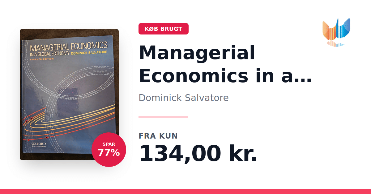 Lige nu kan du købe "Managerial Economics in a Global Economy" af Dominick Salvatore til kun 134,00 kr. Du sparer hele 77% af nyprisen! Bogen du ser her er brugt, og i perfekt stand. Vi har i øjeblikket kun et enkelt eksemplar til salg af "Managerial Economics in a Global Economy", så slå til mens du kan!