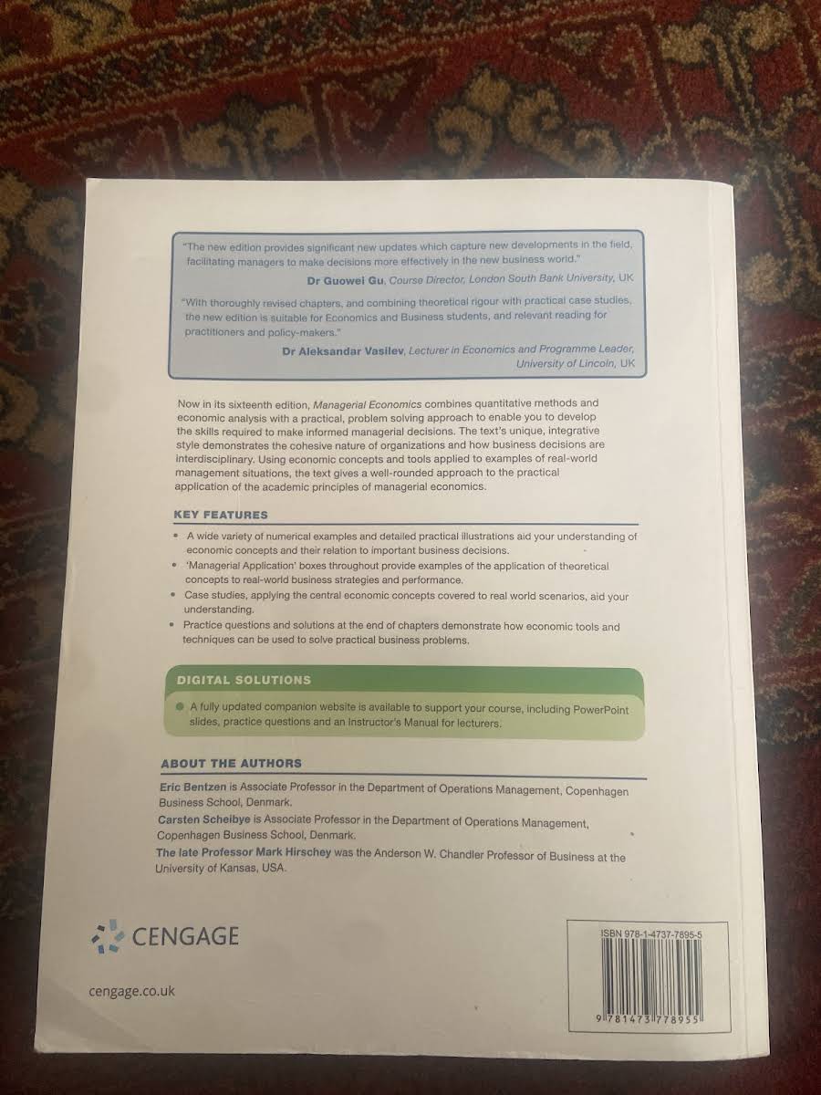 Managerial Economics, authored by Mark Hirschey, Eric Bentzen, and Carsten Scheibye, delivers a robust framework for understanding how economic principles underpin effective managerial decision-making. This comprehensive 2022 edition integrates quantitative methods with economic analysis, offering a practical approach that bridges academic theories and pressing business challenges. Drawing on updated examples and insights from the real world, the text illustrates the interconnected nature of organizational decisions. It emphasizes that business strategies are inherently interdisciplinary, requiring a blend of analytical skills and economic intuition to navigate dynamic market conditions. Spanning 816 pages, Managerial Economics equips readers with essential tools to dissect and interpret complex business scenarios. With its clear, problem-solving orientation, this edition serves as an indispensable resource for students and professionals aiming to apply economic reasoning to managerial challenges.