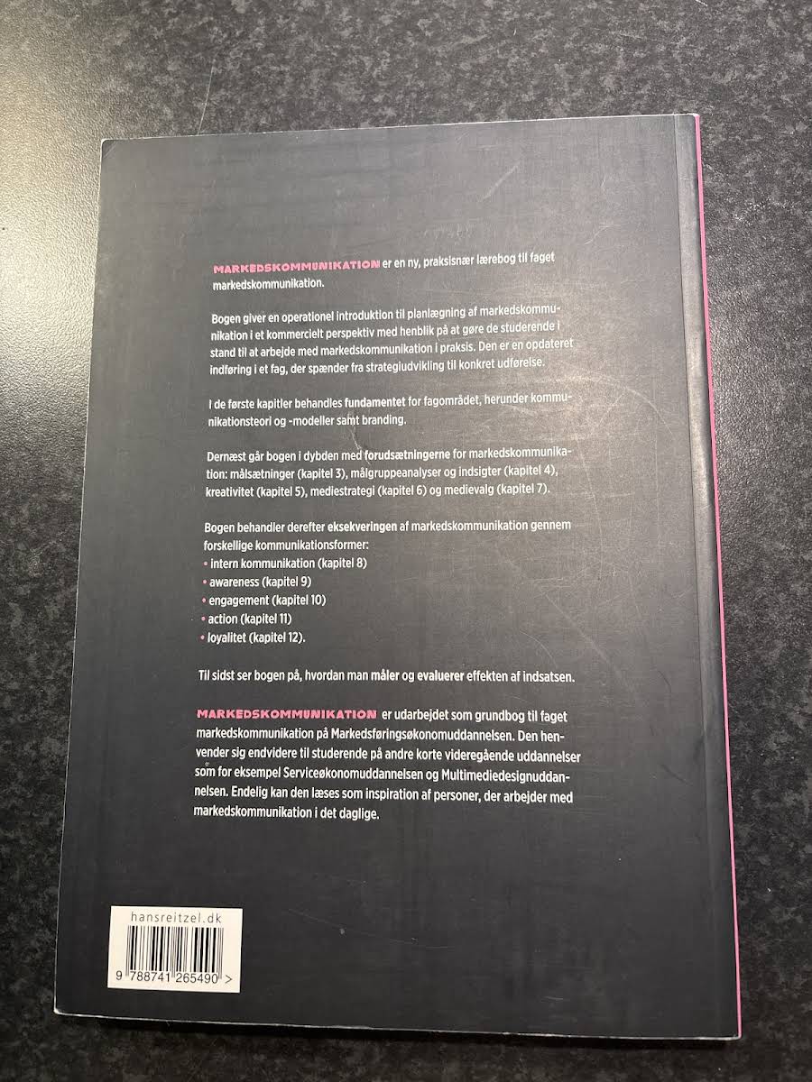 Markedskommunikation er en praksisorienteret lærebog, der giver en operationel introduktion til planlægning og udførelse af markedskommunikation i et kommercielt perspektiv. Bogen er designet til at styrke de studerendes evne til at omsætte teori til praksis, fra strategiudvikling til konkrete kommunikationsindsatser. De første kapitler introducerer de centrale teoretiske fundamenter, herunder kommunikationsteori, kommunikationsmodeller og branding. Herefter uddybes forudsætningerne for effektiv markedskommunikation med fokus på målsætninger (kapitel 3), målgruppeanalyser og indsigter (kapitel 4), samt kreativitet (kapitel 5). Mediestrategi og medievalg behandles efterfølgende i kapitel 6 og 7. Bogens videre kapitler fokuserer på de forskellige faser af eksekvering, herunder intern kommunikation (kapitel 8), awareness (kapitel 9), engagement (kapitel 10), action (kapitel 11) og loyalitet (kapitel 12). Til sidst præsenteres metoder til at måle og evaluere effekten af de samlede indsatser. Med sit praksisnære fokus er bogen en ideel grundlærebog for studiet af markedskommunikation, særligt på Markedsføringsøkonomuddannelsen, men den byder også inspiration til andre videregående uddannelser og professionelle, der arbejder med feltet i det daglige.