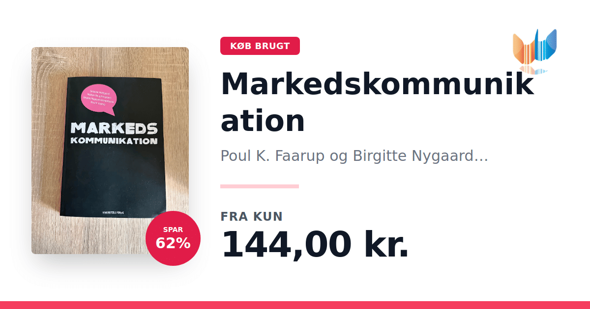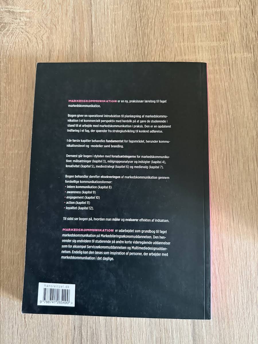 Markedskommunikation er en praksisorienteret lærebog, der giver en operationel introduktion til planlægning og udførelse af markedskommunikation i et kommercielt perspektiv. Bogen er designet til at styrke de studerendes evne til at omsætte teori til praksis, fra strategiudvikling til konkrete kommunikationsindsatser. De første kapitler introducerer de centrale teoretiske fundamenter, herunder kommunikationsteori, kommunikationsmodeller og branding. Herefter uddybes forudsætningerne for effektiv markedskommunikation med fokus på målsætninger (kapitel 3), målgruppeanalyser og indsigter (kapitel 4), samt kreativitet (kapitel 5). Mediestrategi og medievalg behandles efterfølgende i kapitel 6 og 7. Bogens videre kapitler fokuserer på de forskellige faser af eksekvering, herunder intern kommunikation (kapitel 8), awareness (kapitel 9), engagement (kapitel 10), action (kapitel 11) og loyalitet (kapitel 12). Til sidst præsenteres metoder til at måle og evaluere effekten af de samlede indsatser. Med sit praksisnære fokus er bogen en ideel grundlærebog for studiet af markedskommunikation, særligt på Markedsføringsøkonomuddannelsen, men den byder også inspiration til andre videregående uddannelser og professionelle, der arbejder med feltet i det daglige.