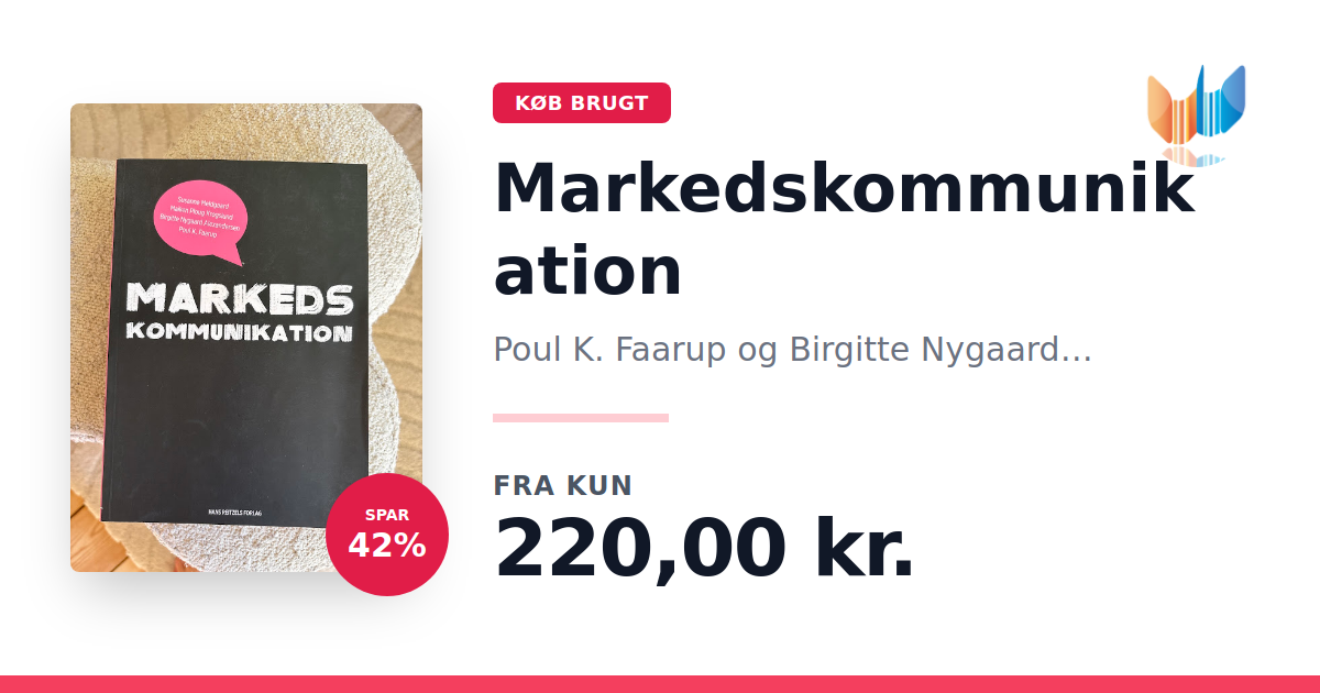 Markedskommunikation er en praksisorienteret lærebog, der giver en operationel introduktion til planlægning og udførelse af markedskommunikation i et kommercielt perspektiv. Bogen er designet til at styrke de studerendes evne til at omsætte teori til praksis, fra strategiudvikling til konkrete kommunikationsindsatser. De første kapitler introducerer de centrale teoretiske fundamenter, herunder kommunikationsteori, kommunikationsmodeller og branding. Herefter uddybes forudsætningerne for effektiv markedskommunikation med fokus på målsætninger (kapitel 3), målgruppeanalyser og indsigter (kapitel 4), samt kreativitet (kapitel 5). Mediestrategi og medievalg behandles efterfølgende i kapitel 6 og 7. Bogens videre kapitler fokuserer på de forskellige faser af eksekvering, herunder intern kommunikation (kapitel 8), awareness (kapitel 9), engagement (kapitel 10), action (kapitel 11) og loyalitet (kapitel 12). Til sidst præsenteres metoder til at måle og evaluere effekten af de samlede indsatser. Med sit praksisnære fokus er bogen en ideel grundlærebog for studiet af markedskommunikation, særligt på Markedsføringsøkonomuddannelsen, men den byder også inspiration til andre videregående uddannelser og professionelle, der arbejder med feltet i det daglige.
