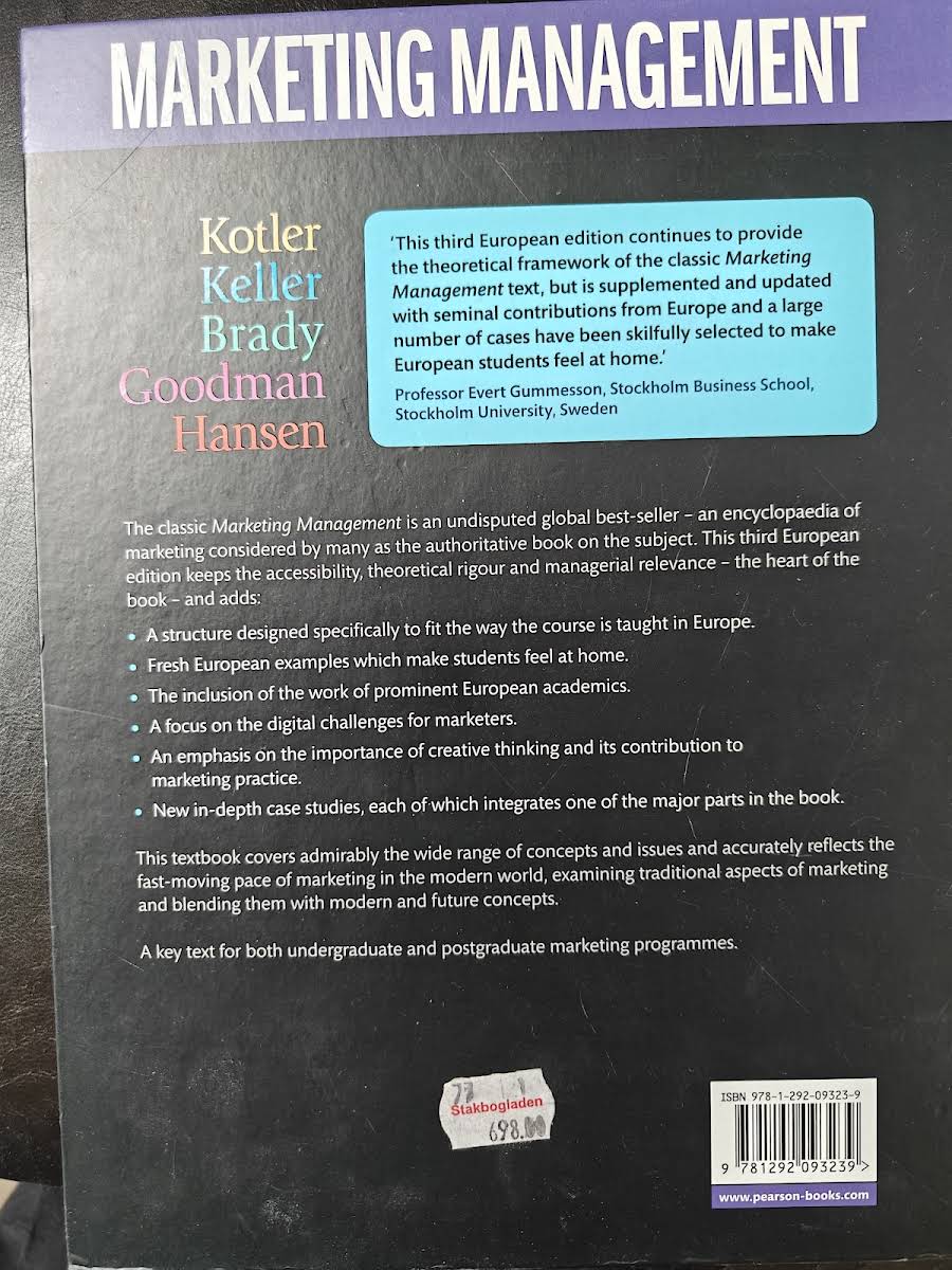 Marketing Management er det globale standardværk i marketing - en omfattende encyklopædi og den definitive guide for alle, der ønsker en dyb forståelse af fagets mange facetter. I denne tredje europæiske udgave fra 2016 bevares bogens karakteristiske klarhed, solide teoretiske fundament og ledelsesmæssige relevans. Samtidig er strukturen skræddersyet til europæiske undervisningsforløb, konkrete eksempler fra kontinentets marketinglandskab er tilføjet, og bidrag fra fremtrædende europæiske forskere er indarbejdet. Ud over det klassiske indhold møder læseren et skarpt fokus på digitale udfordringer og betydningen af kreativ tænkning i moderne marketing, ligesom nye dybdegående case-studier illustrerer centrale temaer gennem hele bogen. Med sin unikke kombination af traditionelle marketingprincipper og fremadskuende perspektiver er Marketing Management et uundværligt opslagsværk og lærebog for både bachelor- og kandidatstuderende.
